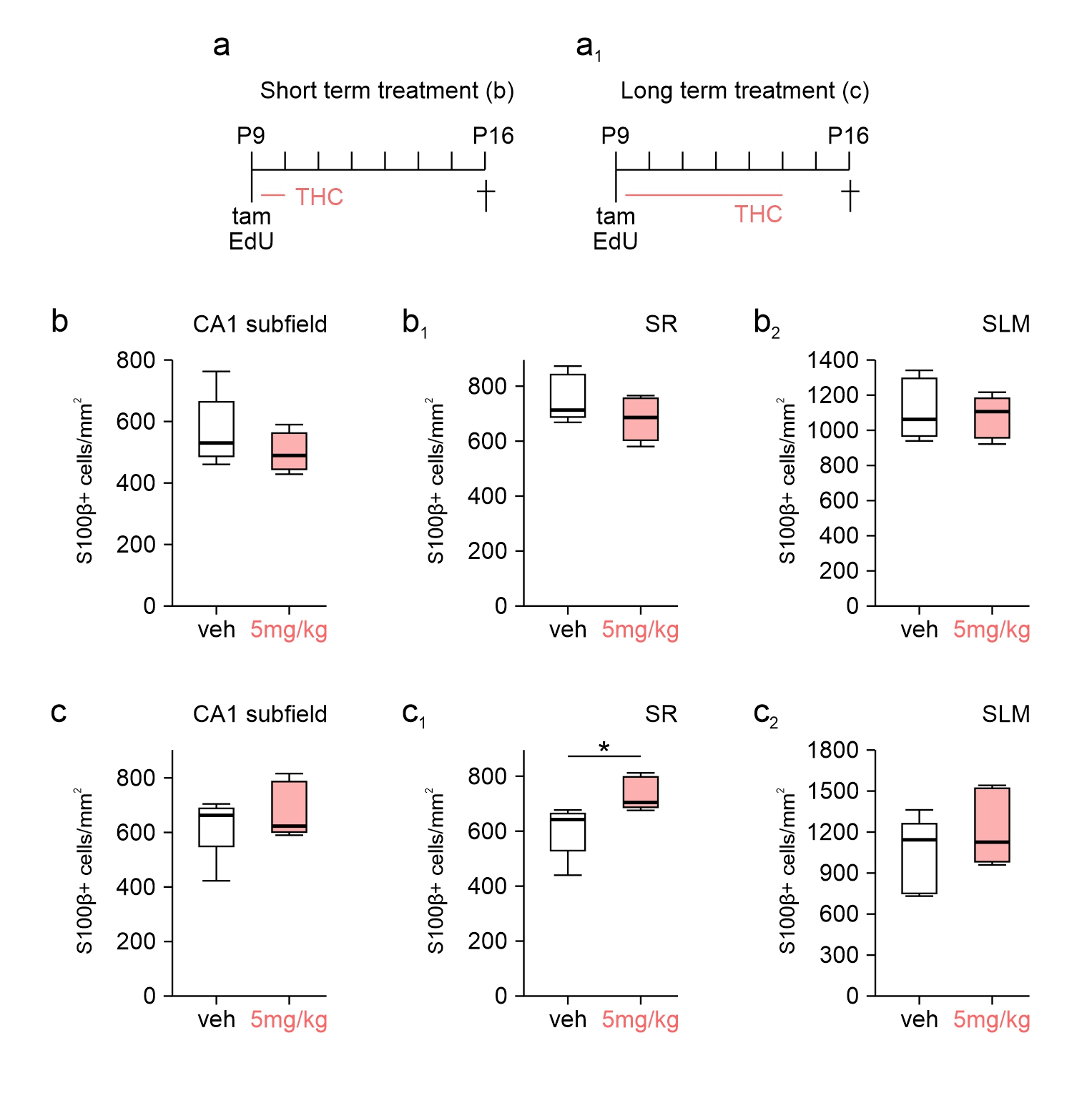 - Supplementary file1 (JPG 339 kb)—Figure S1. Astrocyte numbers after THC exposure. (a, a1) Treatment paradigms used in this study. (b–c2) S100β cell counts in the CA1 subfield, SR and SLM in the short term (b–b2) and long term (c–c2) paradigm. *P ≤ 0.05. (JPG)