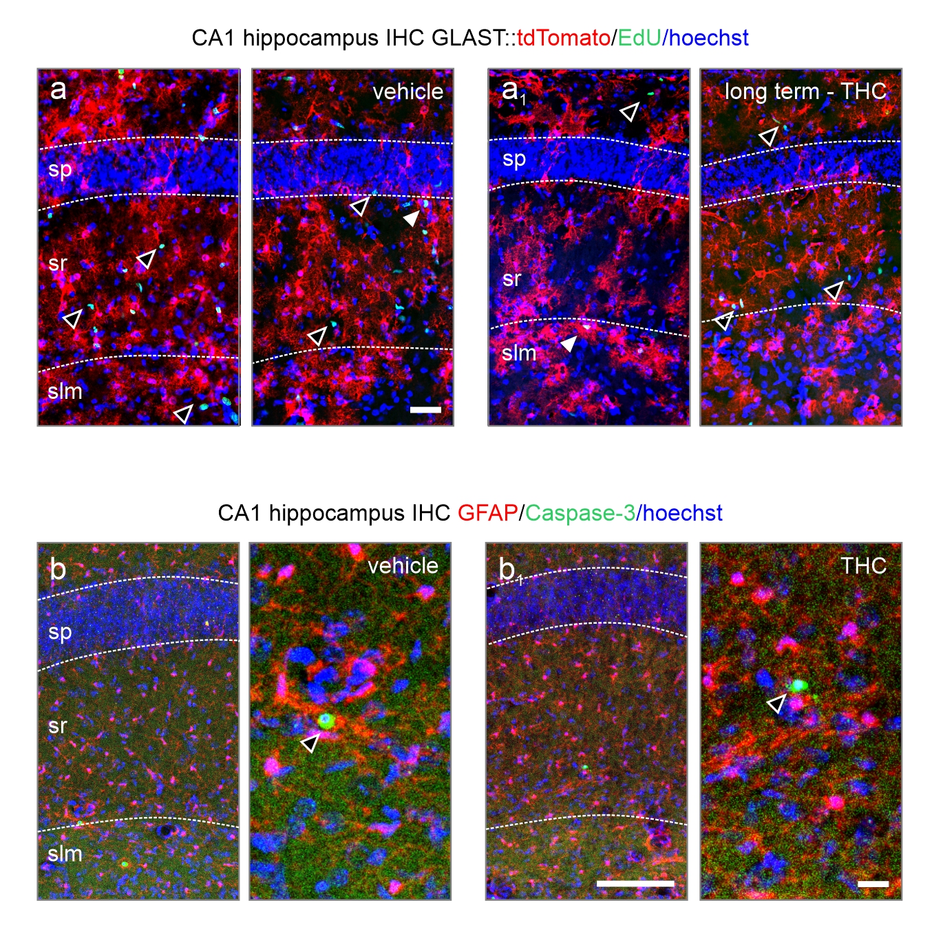 - Supplementary file2 (JPG 1718 kb)—Figure S2. Astrocyte proliferation and apoptosis in vivo. (a, a1) EdU stainings show no significant changes over hippocampal layers. Arrowheads denote astrocyte co-localization with EdU, while open arrowheads do not. (b–b2) Total numbers of cleaved caspase-3 levels in the CA1 subfield, SR and SLM of the short term paradigm. Scalebars = 100 µm (b1), 25 µm (a, b1 (right)). *P ≤ 0.05. (JPG)