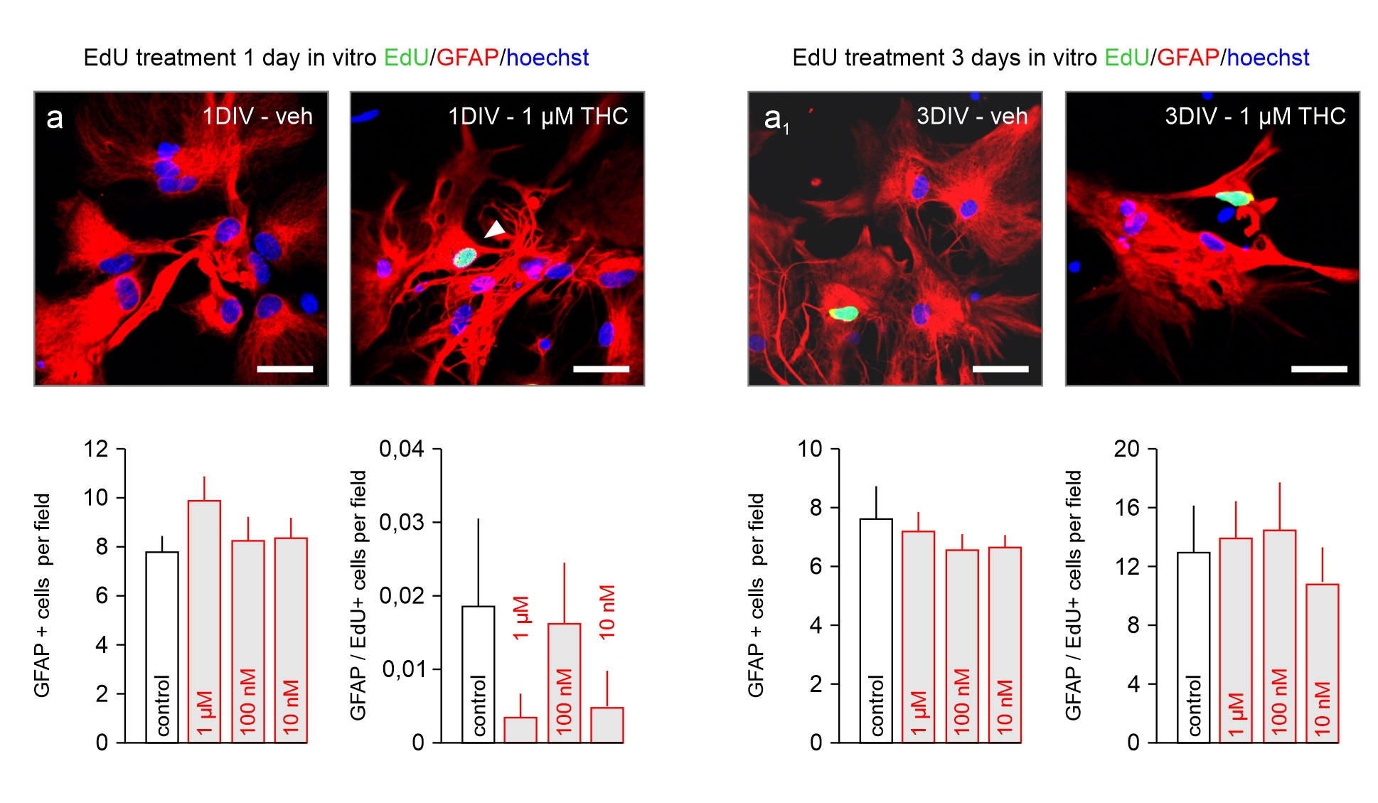 - Supplementary file3 (JPG 761 kb)—Figure S3. Astrocyte proliferation in vitro. (a, a1) EdU stainings show no significant changes with GFAP co-labelling when cultured for 1 and 3 days in vitro (DIV). Arrowheads denote astrocyte co-localization with EdU. Scalebars = 10 µm. (JPG)