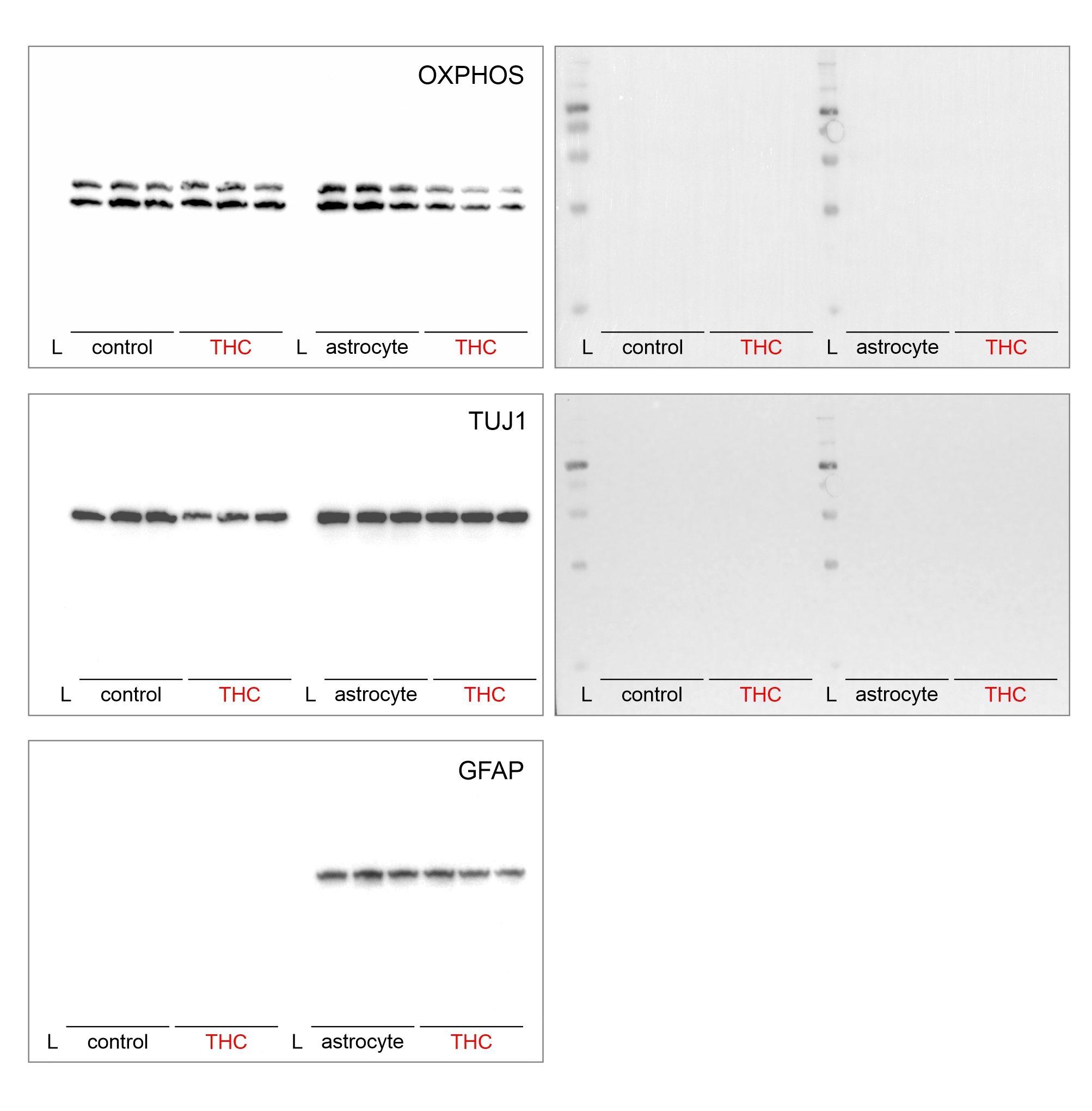sTHC (10 µM) treated co-cultures were lysed after 1 day of stimulation and homogenized in cell lysis buffer (100 mM Tris, pH 7.4, 150 mM NaCl, 1 mM EGTA, 1 mM EDTA, 1% Triton X-100, 0.5% sodium deoxycholate, 1× protease inhibitor, 1× phosphatase inhibitor) before preparing the total protein fractions. Protein concentrations were determined using the Pierce BCA Protein Assay Kit (Thermo Scientific). For protein analysis, 5.36 μg of each sample was used. Protein samples underwent a denaturation step at 95 °C for 5 min and loaded on 10% separation gels before being transferred onto a PVDF membrane. The membrane was blocked (5% skim milk powder (Sigma) in TBS-T) before primary antibodies were added for overnight incubation at 4 °C. The following antibodies were used: Ms-βIII-tubulin as neuronal marker (TUJ1, 1:3000), Gp-GFAP for glia (Synaptic Systems, 1:1000) and Ms-OXPHOS for mitochondrial subunits (Abcam, 1:500). Primary antibodies were removed through a series of TBS-T and TBS washes. Subsequently, membranes were exposed to HRP-conjugated secondary antibodies (Jackson Immuno Research, 1:1000) for 1 h at RT. Clarity Wester ECL Substrate (BioRad) was used for developing the HRP conjugated immunoblot and visualized with a ChemiDoc MP Imaging System (BioRad). Membranes were stripped with Restore Western blot stripping buffer (Thermo Scientific) and reimaged before restaining to prevent signal bleed through.