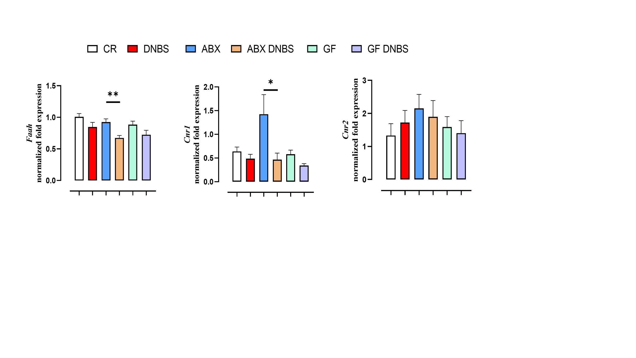 Given that both AEA and 2-AG signal through the CB1 and CB2 receptors (encoded by Cnr1 and Cnr2), which have previously been shown to play a role in the development of IBD [ref. 42, ref. 43], we measured the gene expression of these two receptors in the colon. ABX mice tended to have increased Cnr1 expression as compared to the other mice, an effect that was statistically significant only vs. ABX-DNBS mice (Supp. Figure 1), though, as for Faah, no statistically significant differences among the various DNBS-treated cohorts were detected. No differences in Cnr2 expression were observed (Supp. Figure 1).
