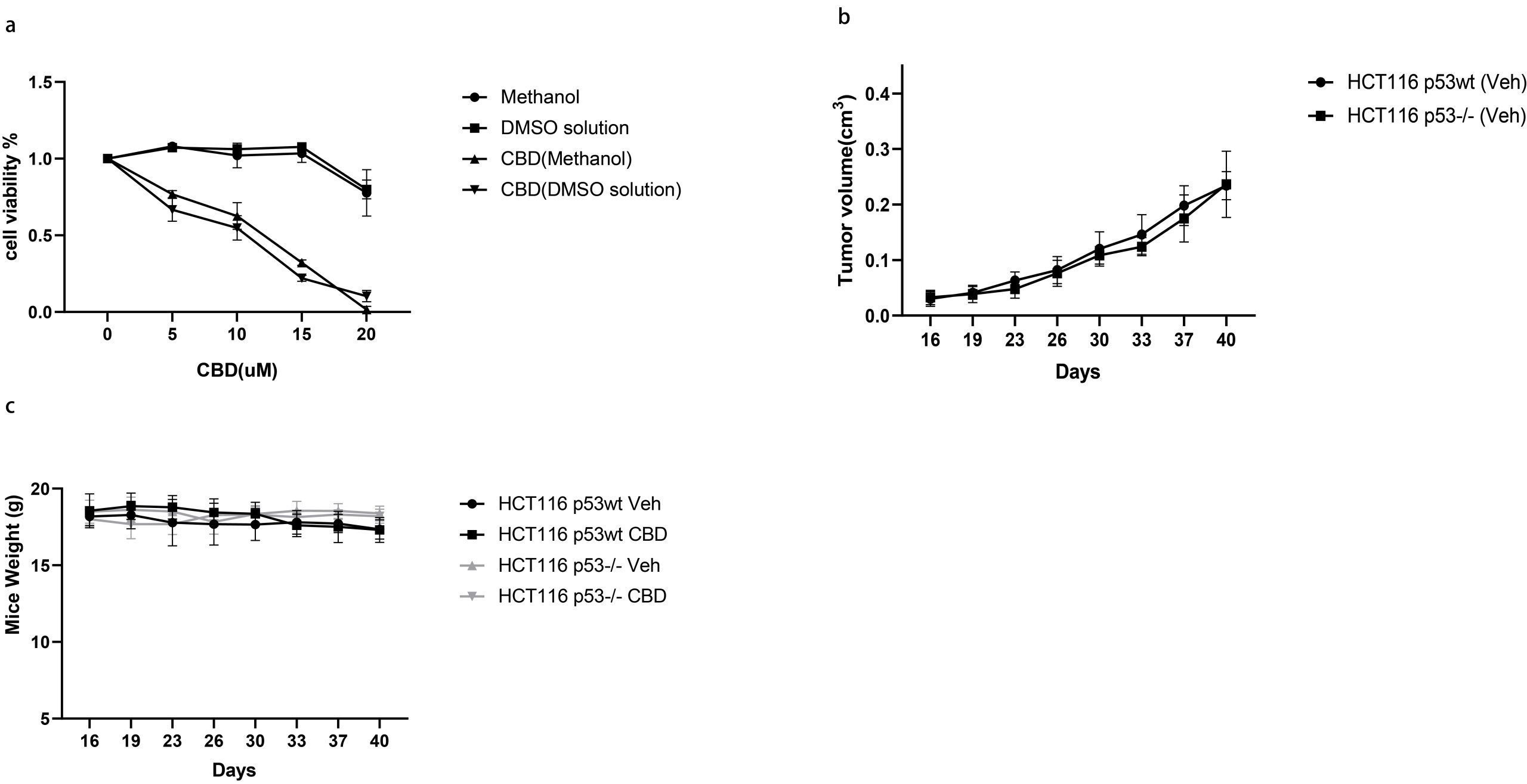 Mice were randomly divided into two groups. HCT116 p53wt (2 × 106) and the slower growing HCT116 p53−/− cells (2.8 × 106) were subcutaneously injected into 8-week-old female SCID mice in 100 µl McCoy’s 5 A medium 24 h after a 3 Gy whole-body irradiation. Tumor size, as measured using a caliper and body weight were measured twice per week. CBD (PhytoLab GmbH&Co.KG) was dissolved in a solution (5% DMSO, 5% Tween 80 (P4780, Sigma), 90% stroke-physiological saline solution) injected intraperitoneally (20 mg/kg, i.p.) 5 times a week for 5 weeks in total, from day 5 onwards. Mice were sacrificed on day 40 by isoflurane. Four to six mice were included in each group.