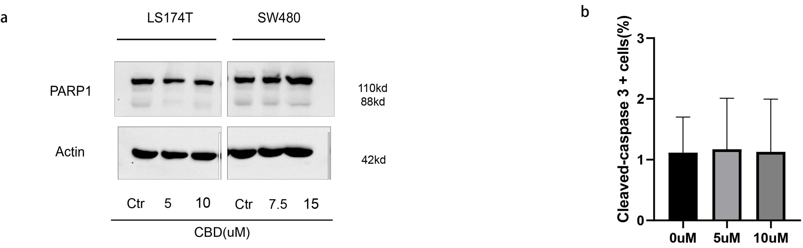 We further investigated the antitumoral effect of CBD in a xenograft tumor mouse model. For this, HCT116 p53wt and HCT116 p53−/− cells were injected subcutaneously (s.c.) into immunodeficient SCID mice following a whole-body irradiation with 3 Gy. To avoid methanol induced toxicity in mice, DMSO instead of methanol was used as the vehicle for CBD in the mouse experiment. We could demonstrate that irrespective of the vehicle (methanol or DMSO), CBD exerts comparable effects on cell viability of HCT116 p53wt cells, as demonstrated in a CCK8 assay (Supplementary Fig. 1a). Tumor-bearing mice were treated five times a week with CBD with the non-toxic dose of 20 mg/kg for 5 weeks as illustrated schematically in Fig. 2c. A significant reduction in the volume of HCT116 p53wt tumors was observed in mice after CBD treatment compared to the DMSO vehicle control from day 37 onwards (Fig. 2d). In contrast, the volume of HCT116 p53−/− tumors was not significantly reduced by the CBD treatment at any time point (Fig. 2e), suggesting that a long-term CBD treatment only decreases the growth of p53wt, but not p53−/− tumors. Preliminary studies demonstrated that the growth of HCT116 p53wt and HCT116 p53−/− cell-derived tumors was comparable when 2.0 × 106 p53wt and 2.8 × 106 p53−/− cells were injected s.c., respectively (Supplementary Fig. 1b). The treatment with CBD or the vehicle DMSO did not elicit any negative side effects in mice since the body weight of the mice was comparable in all treatment groups over a period of 40 days (Supplementary Fig. 1c). Representative examples of tumors treated either with vehicle or CBD are illustrated in Fig. 2f. Immunohistochemical analysis revealed a cell vacuolization in H&E sections of HCT116 p53wt tumors following CBD treatment, which was barely seen in HCT116 p53−/− tumors (Fig. 2g). Moreover, CBD induced a weak elevation in caspase-3 expression in HCT116 p53wt tumors which is indicative for apoptosis, whereas almost no apoptosis was apparent in HCT116 p53−/− tumors (Fig. 2g). With respect to DNA strand breaks, cleaved PARP1 was only accumulated in HCT116 p53wt cells upon a treatment with CBD at a concentration of 15 µM. This finding corresponds to an increase in the proportion of TUNEL positive cells (Fig. 2h, i). Similar to HCT116 p53−/− cells, there was no significant difference in cleaved PARP1 expression after CBD treatment in SW480 p53mut cells (Fig. 2h and Supplementary Fig. 2a). However, in contrast to HCT116 p53wt cells, in LS174T p53wt cells neither cleaved PARP1 nor cleaved-caspase-3 were found to be upregulated (Supplementary Fig. 2a, b).