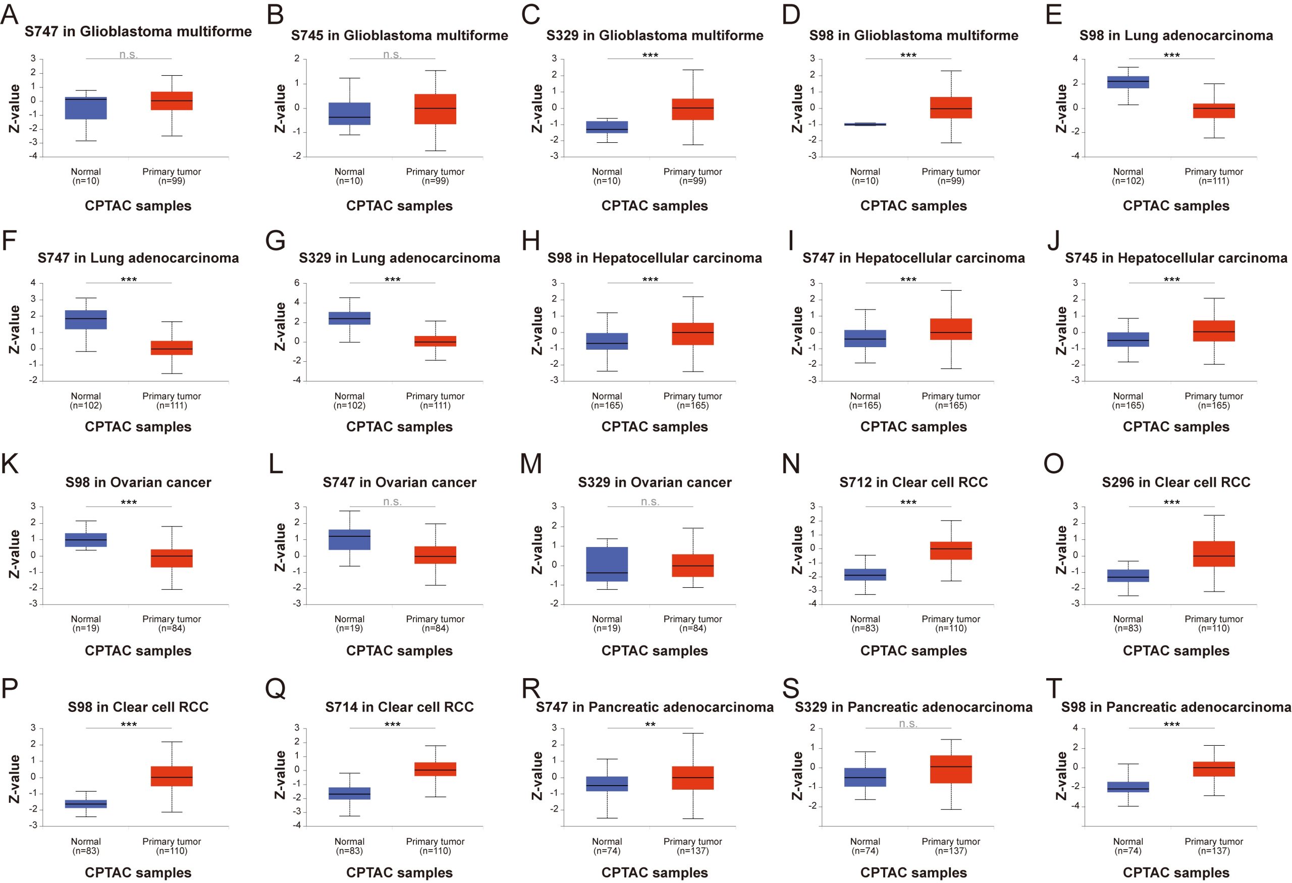 - Additional file 2: Figure S2. Analysis of protein phosphorylation of AFAP1L1 in human cancers. The protein phosphorylation of AFAP1L1 in several cancers using the UALCAN web tool with CPTAC dataset. The differences in AFAP1L1 phosphoprotein (including phosphorylation sites S747, S745, S329, S98, S712, S296, and S714) between normal tissue and primary tissue was visualized by box plots. GBM A–D, LUAD E–G, HCC H–J, ovarian cancer K–M, clear cell RCC N–Q, and PAAD R–T. P-value was calculated by unpaired t-test. *: p-value < 0.05; **: p-value <0.01; ***: p-value <0.001; n.s.: no significance. (TIF)