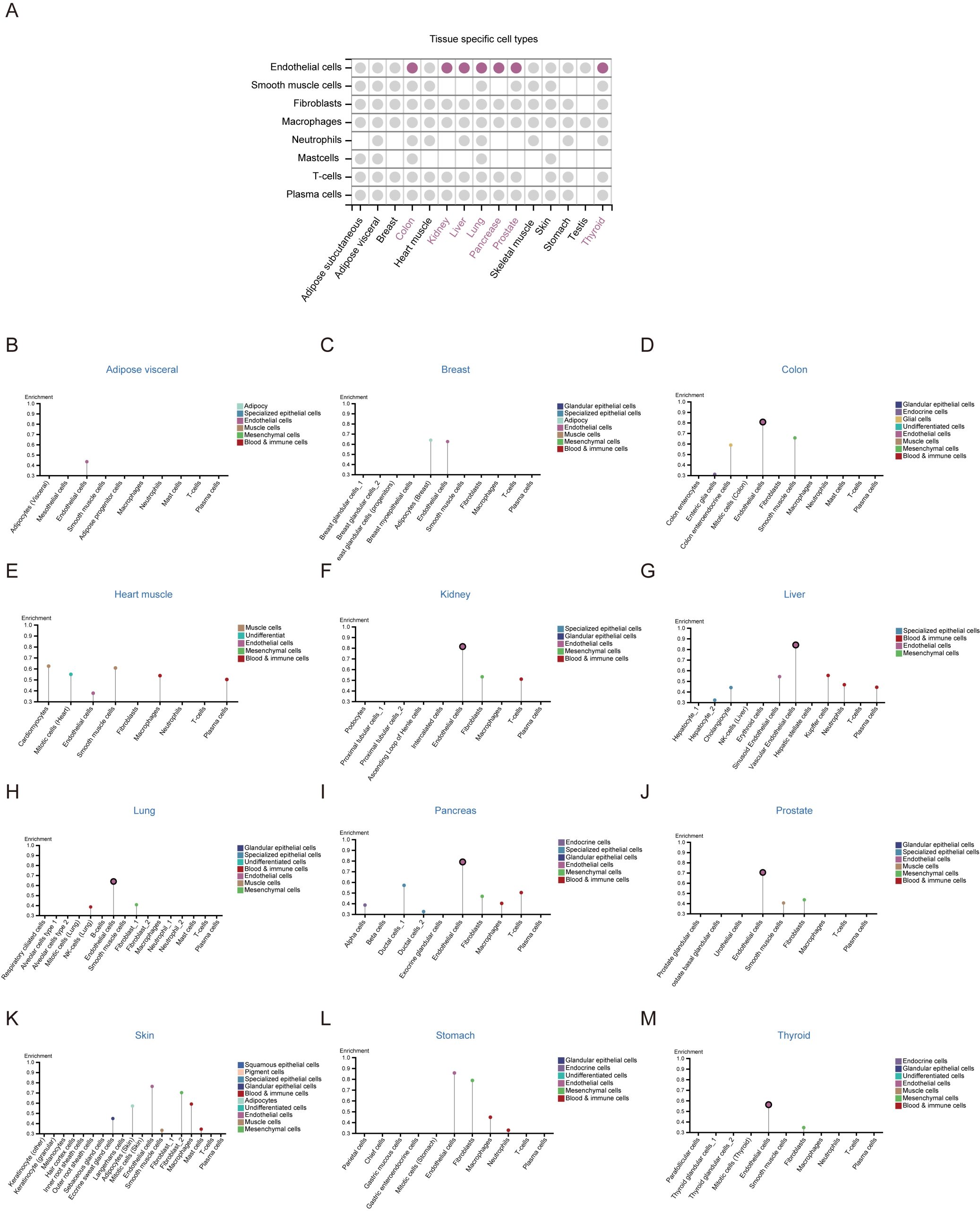 - Additional file 3: Figure S3. The tissue cell type classification of AFAP1L1 from the HPA dataset. A The core cell type table displays the enrichment scores of AFAP1L1 in eight cell types found in many tissues (the enriched cell type is indicated in purple). B–M The plots show the enrichment scores for AFAP1L1 in each cell type, in each tissue. An enlarged and bolded circle indicates classification of AFAP1L1 as cell type enriched in the corresponding cell type. (TIF)
