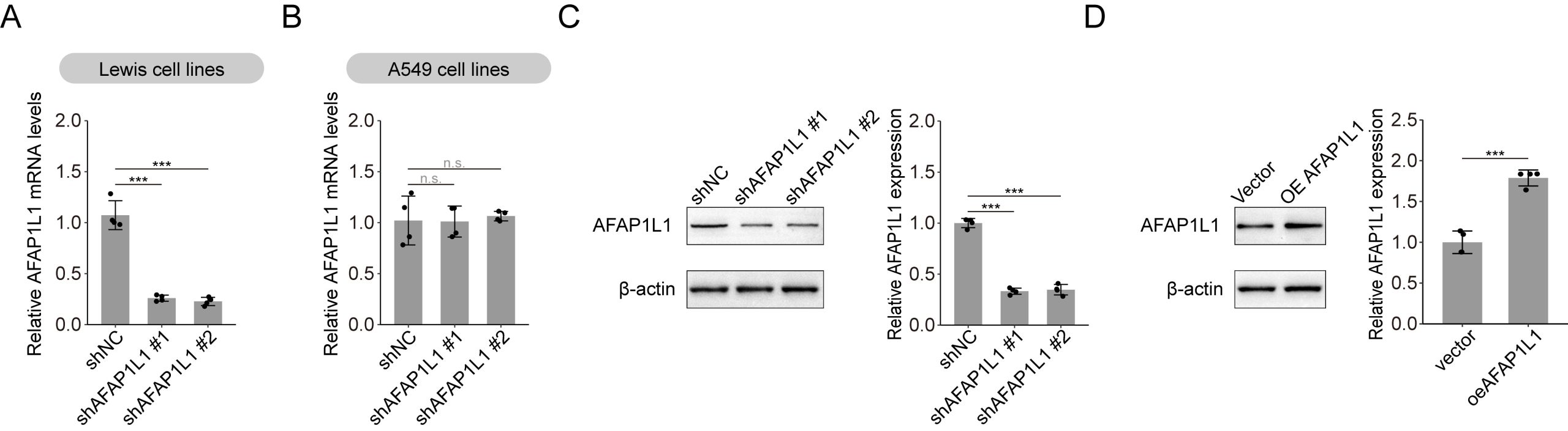 - Additional file 4: Figure S4. The efficiency of shRNA lentivirus and plasmids was evaluated by qRT-PCR and western blot analysis. A QRT-PCR analyses of AFAP1L1 mRNA expression in Lewis cell lines after stable knockdown of AFAP1L1 by shRNA lentiviral transfection. Quantification of the knockdown efficiency of lentiviral shRNA against AFAP1L1. Results are presented as mean ± SEM, statistical analyses were performed using one-way ANOVA with Bonferroni’s post hoc test. (n=4 independent experiments). B QRT-PCR analyses of AFAP1L1 mRNA expression in A549 cell lines after stable knockdown of AFAP1L1 by shRNA lentiviral transfection. Quantification of the knockdown efficiency of lentiviral shRNA against AFAP1L1. Results are presented as mean ± SEM, statistical analyses were performed using one-way ANOVA with Bonferroni’s post hoc test. (n=4 independent experiments). C Western blot analyses of AFAP1L1 and β-actin protein expression in HUVEC cells after stable knockdown of AFAP1L1 by shRNA lentiviral transfection. Densitometric quantitation of western blot band intensity shown in C. Results are presented as mean ± SEM, statistical analyses were performed using one-way ANOVA with Bonferroni’s post hoc test. (n=4 independent experiments). D Western blot analyses of AFAP1L1 and β-actin protein expression in HUVEC cells after overexpression of AFAP1L1 by plasmids transfection. Densitometric quantitation of western blot band intensity shown in D. Results are presented as mean ± SEM, statistical analyses were performed using two-tailed student’s t-test. (n=4 independent experiments). *: p-value < 0.05; **: p-value <0.01; ***: p-value <0.001; n.s.: no significance. (TIF)