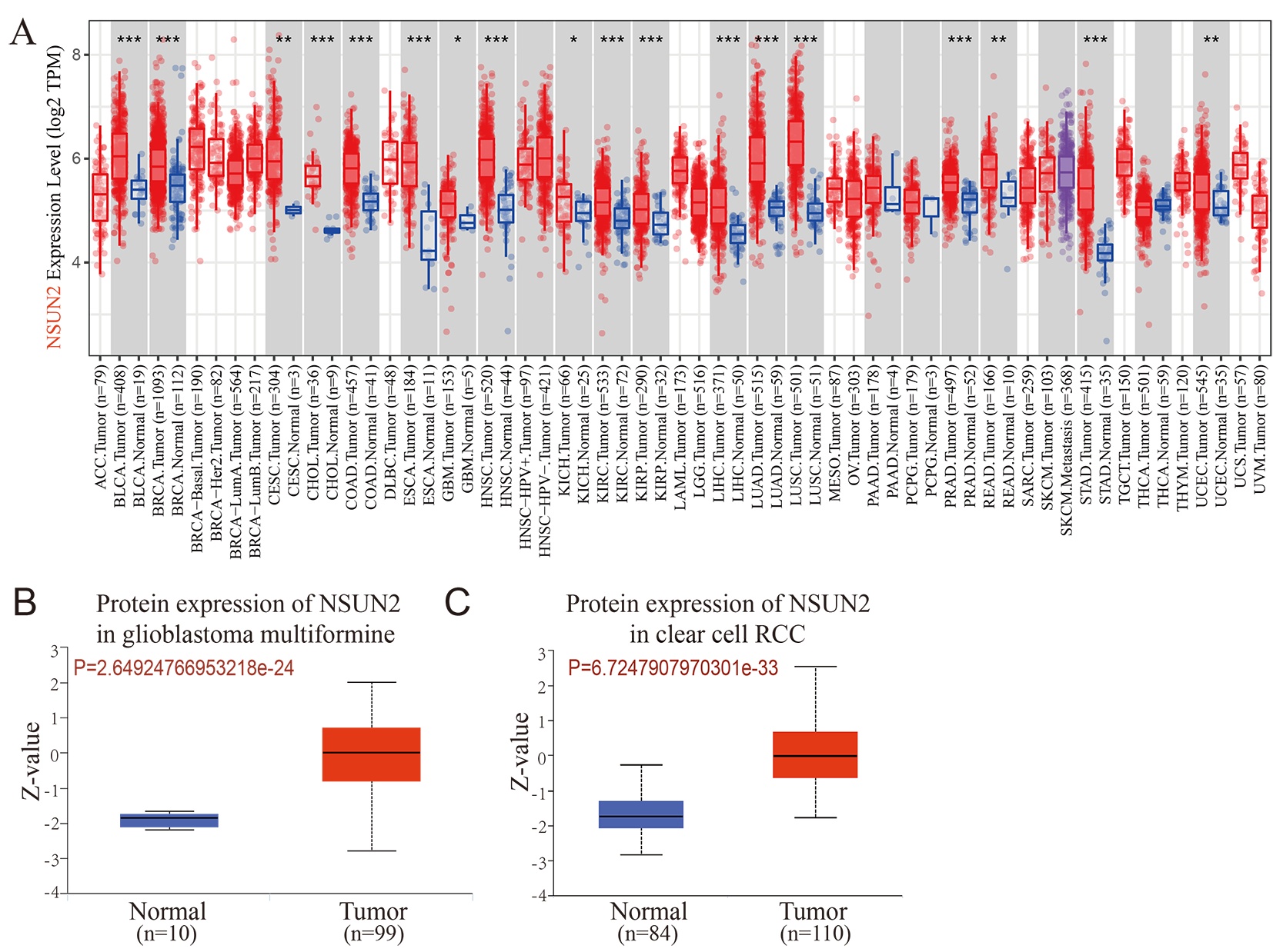 - Expression of NSUN2 in tumor types.(A) Analysis of mRNA expression of NSUN2 in different cancer types by TIMER database. (B) Protein expression of NSUN2 in glioblastoma multiformine. (C) Protein expression of NSUN2 in clear cell RCC (*P<0.05, **P<0.01, ***P<0.001).(TIF) (TIF)