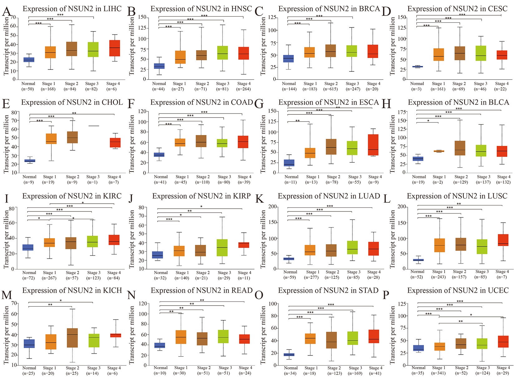 - Analysis of the individual cancer stages of NSUN2 in different cancer types by UALCAN database.(A) In LIHC. (B) In HNSC. (C) In BRCA. (D) In CESC. (E) In CHOL. (F) In COAD. (G) In ESCA. (H) In BLCA. (I) In KIRC. (J) In KIRP. (K) In LUAD. (L) In LUSC. (M) In KICH. (N) In READ. (O) In STAD. (P) In UCEC (*P<0.05, **P<0.01, ***P<0.001).(TIF) (TIF)