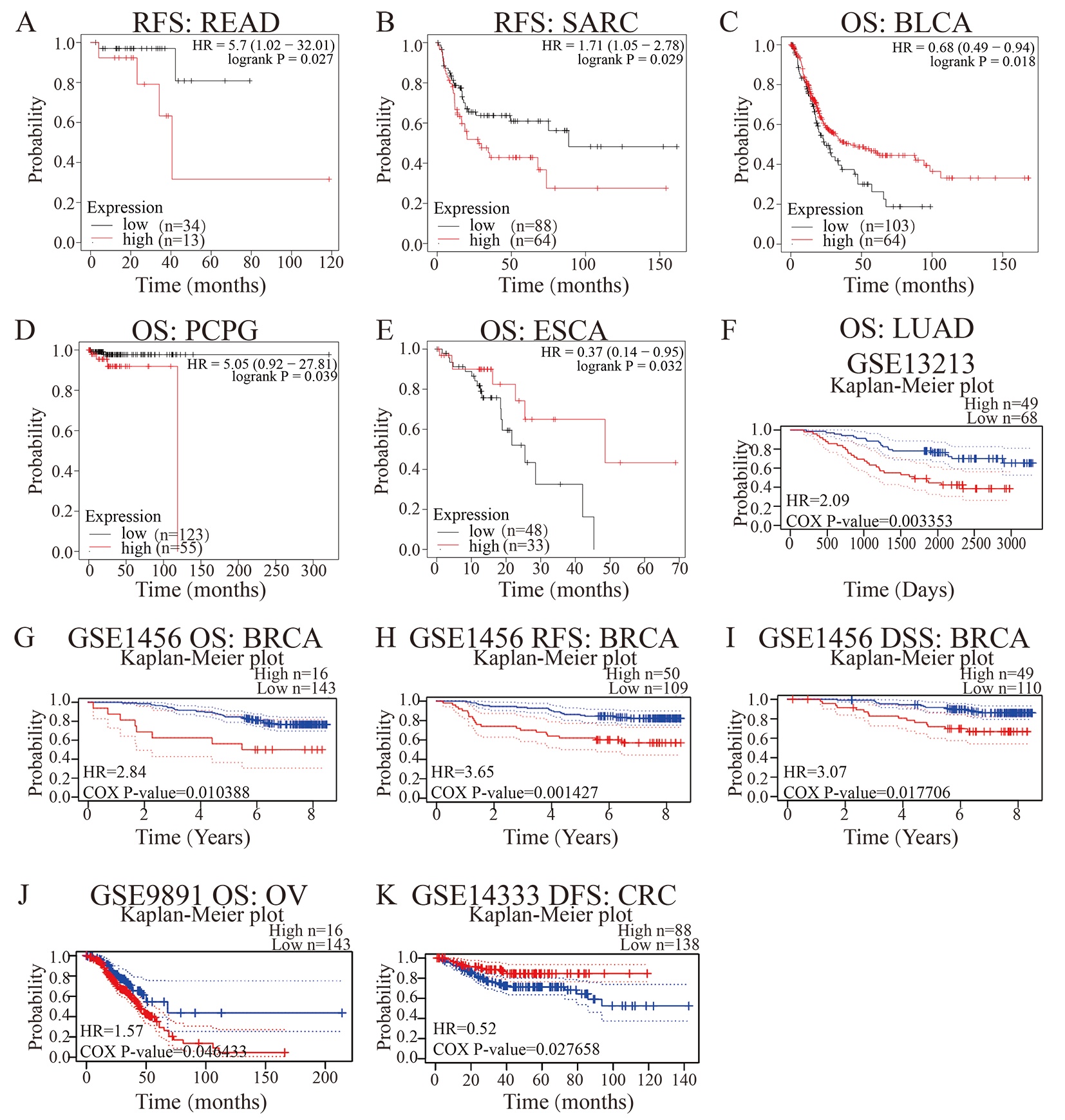 - Survival curve of NSUN2 by the Kaplan‒Meier plotter database and PrognoScan database.(A-B) RFS in READ and SARC cohorts. (C-E) OS in BLCA, PCPG and EACA cohorts. (F) OS in LUAD cohorts. (G-I) OS, RFS and DSS in BRCA cohorts. (J) OS in OV cohorts. (K) DFS in CRC cohorts. OS, overall survival. RFS, relapse-free survival. DSS, disease Specific survival. DFS, disease free survival.(TIF) (TIF)