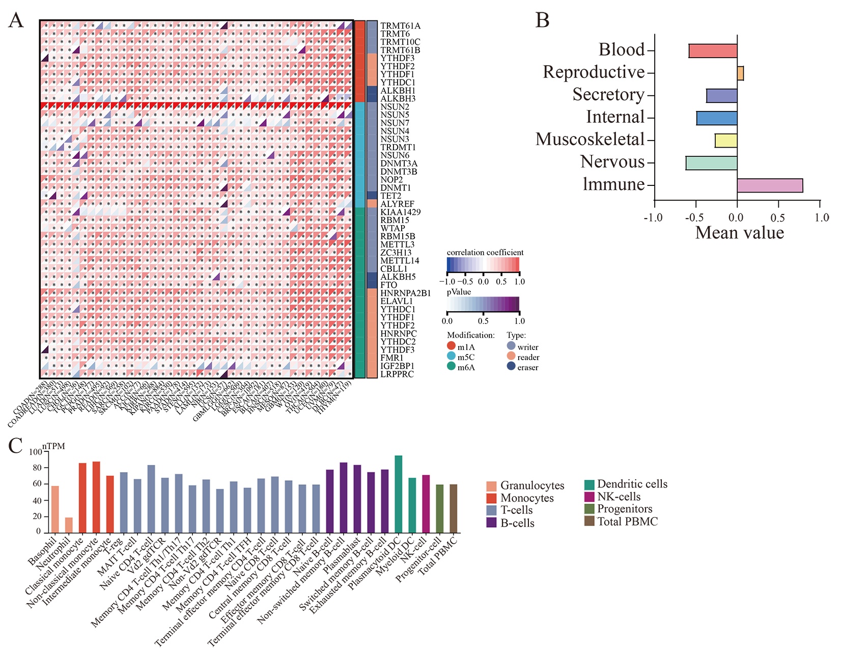 - RNA modification and expression of NSUN2 in immune cells.(A) Analysis between NSUN2 and RNA modification-related genes. (B) Protein expression of NSUN2 in different seven cells or tissue types. (C) Expression of NSUN2 in immune cells.(TIF) (TIF)