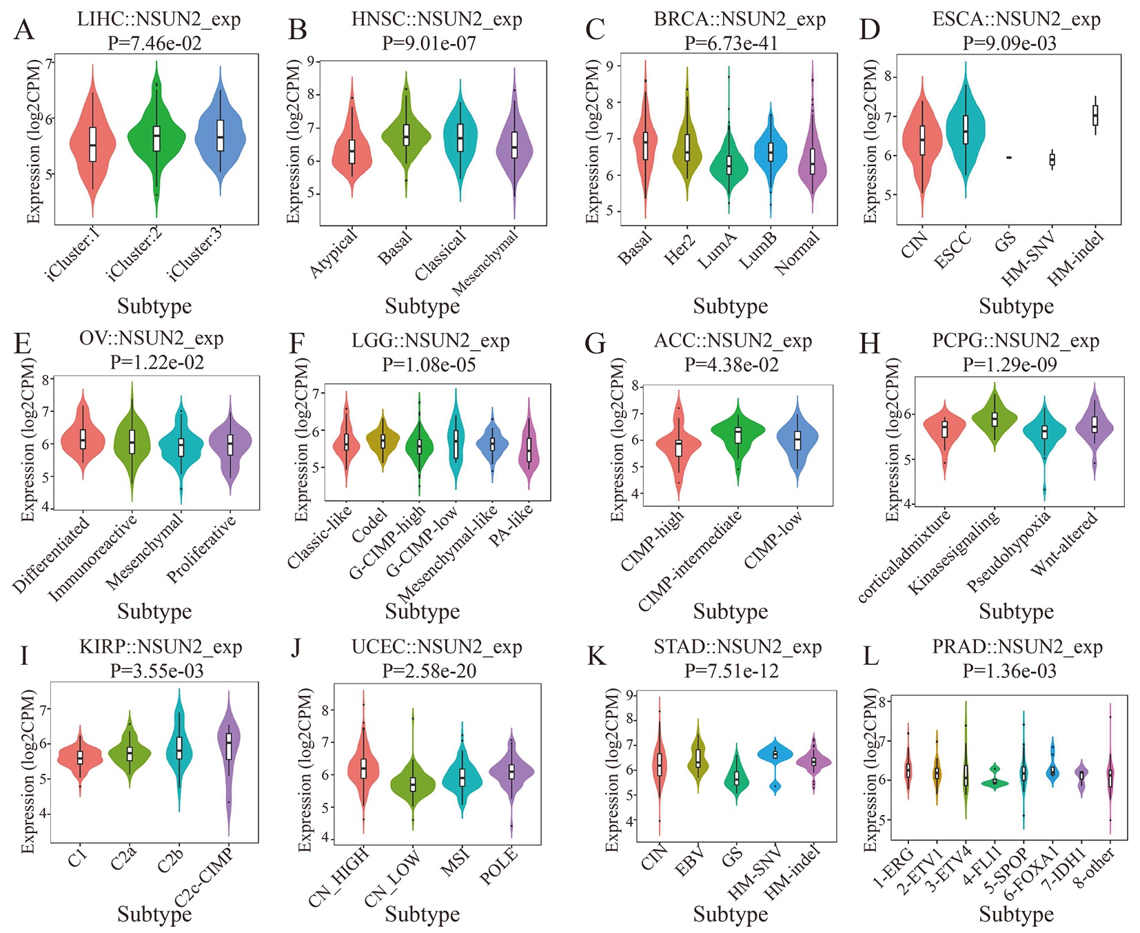 - Correlation analysis between NSUN2 and molecular subtype in different cancer types.(A) In LIHC. (B) In HNSC. (C) In BRCA. (D) In ESCA. (E) In OV. (F) In LGG. (G) In ACC. (H) In PCPG. (I) In KIRP. (J) In UCEC. (K) In STAD. (L) In PRAD.(TIF) (TIF)