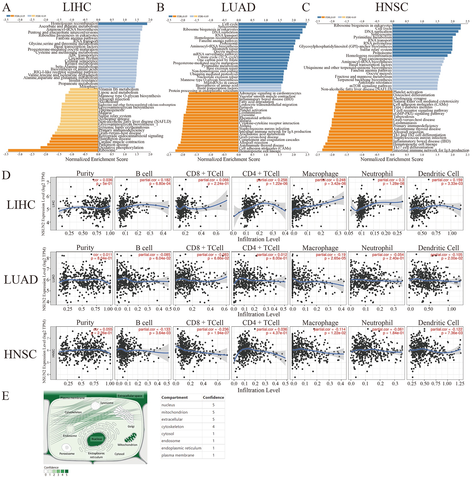 The subcellular localization and function of NSUN2 in LIHC, LUAD and HNSC