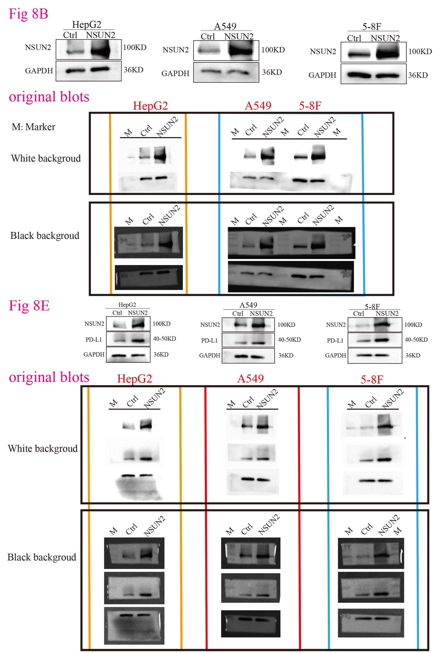 Overall, NSUN2 was highly expressed and related to a poor prognosis in most types of cancers and was also significantly associated with immune molecular subtypes in some cancer types. Furthermore, NSUN2 was significantly associated with the levels of ICPs and immunoregulatory genes. In addition, NSUN2 was found to be involved in a series of immune-related biological processes, such as the humoral immune response in LIHC and LUAD and T-cell activation and B-cell activation in HNSC. Immunofluorescence and CCK-8 assays also confirmed that NSUN2 was widely expressed in the nucleus and cytoplasm, and overexpression of NSUN2 promoted the proliferation and migration of HepG2, A549 and 5-8F cells. NSUN2 was also confirmed to positively regulate the expression of PD-L1.