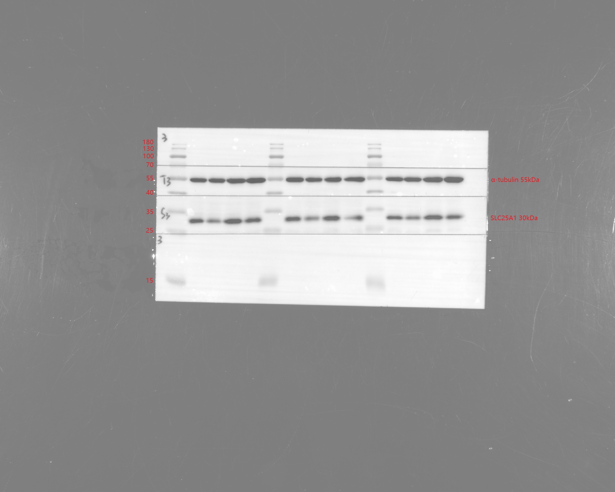 Collected cells were homogenized in lysis buffer (5% SDS, 10 mM EDTA, 50 mM NaCl, 10 mM Tris–HCl). Protein concentrations were measured using pierce BCA protein assay (Thermo Fisher, Rockford, IL, USA). Proteins were run on a standard SDS-PAGE and transferred to PVDF membranes. Membranes were blocked in 5% milk, incubated with primary antibody at a concentration of 1: 1000, then incubated with secondary antibody at a concentration of 1: 10 000 and read using ECL detection system (Bio-Rad, Richmond, CA). The anti-SLC25A1 (15235-1-AP) and anti- alpha-tubulin (11224-1-AP) were purchased from Proteintech.