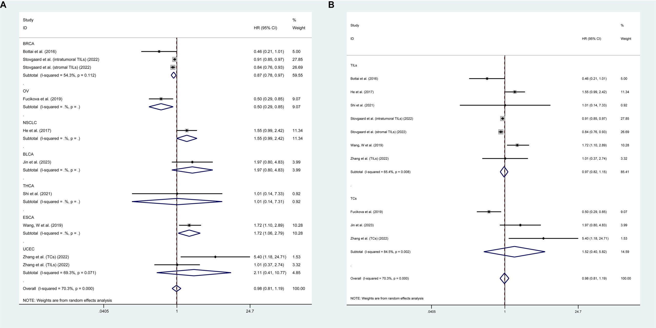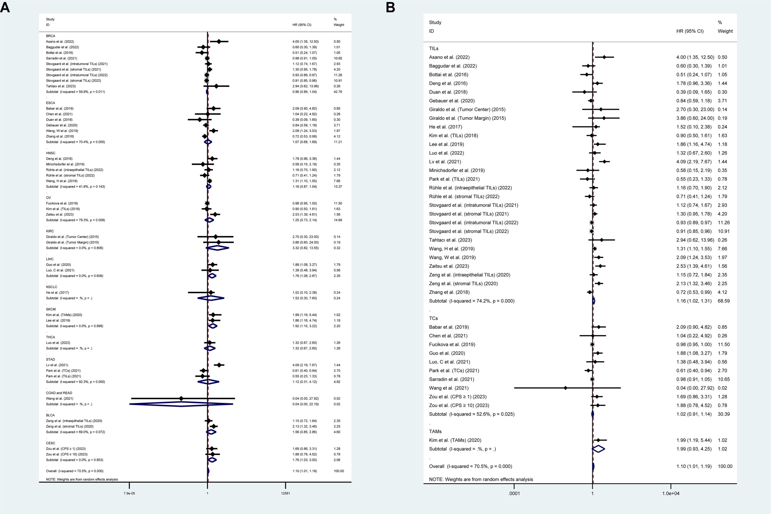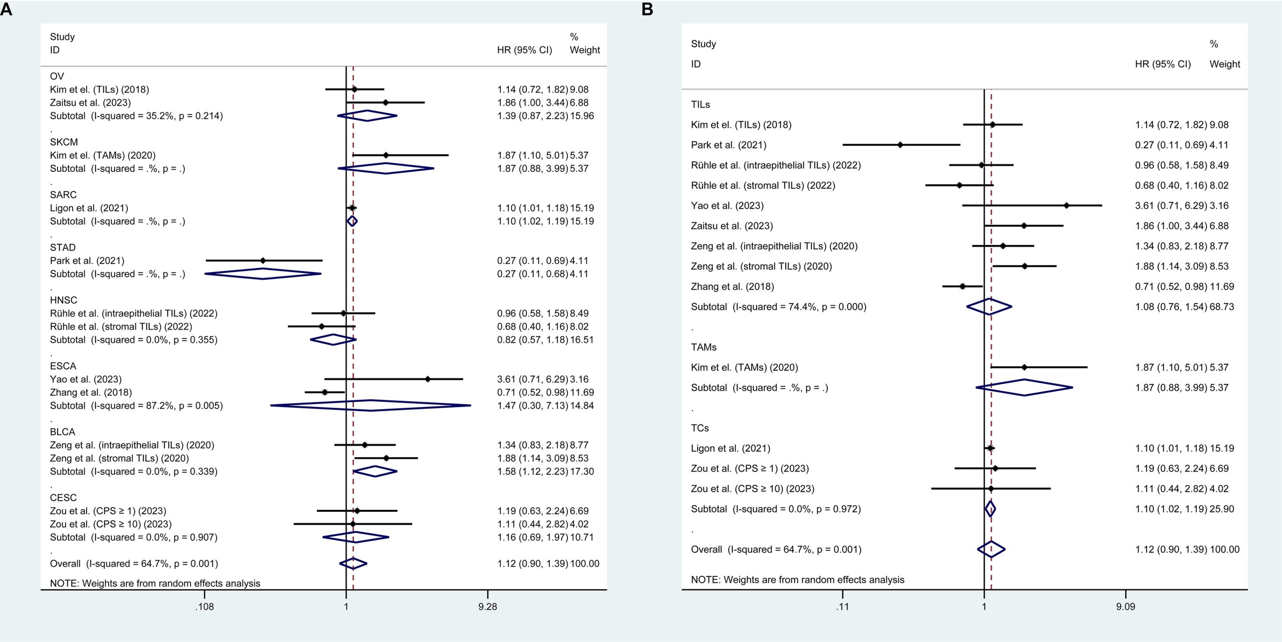 | Lv (2021) | China | 564 | RCS | STAD | Surgery | 228 (40.4) | TILs | Median level | IHC | OS | Univariate |