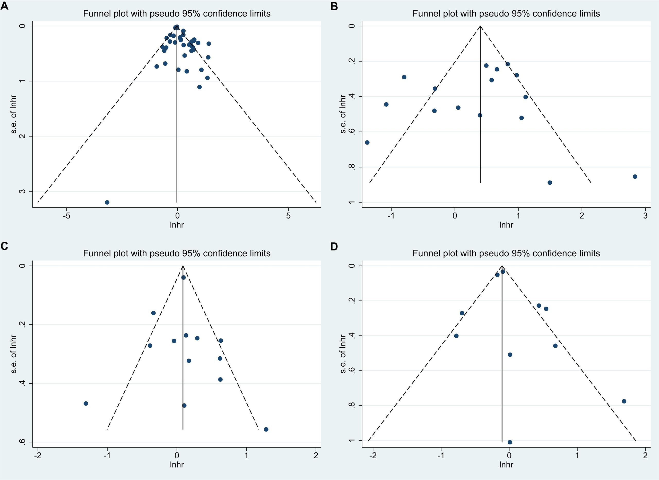 - Additional file 6: Figure S6. Publication bias detected by funnel plots of A overall survival, B disease-free survival, C progression-free survival, D recurrence-free survival. (TIF)