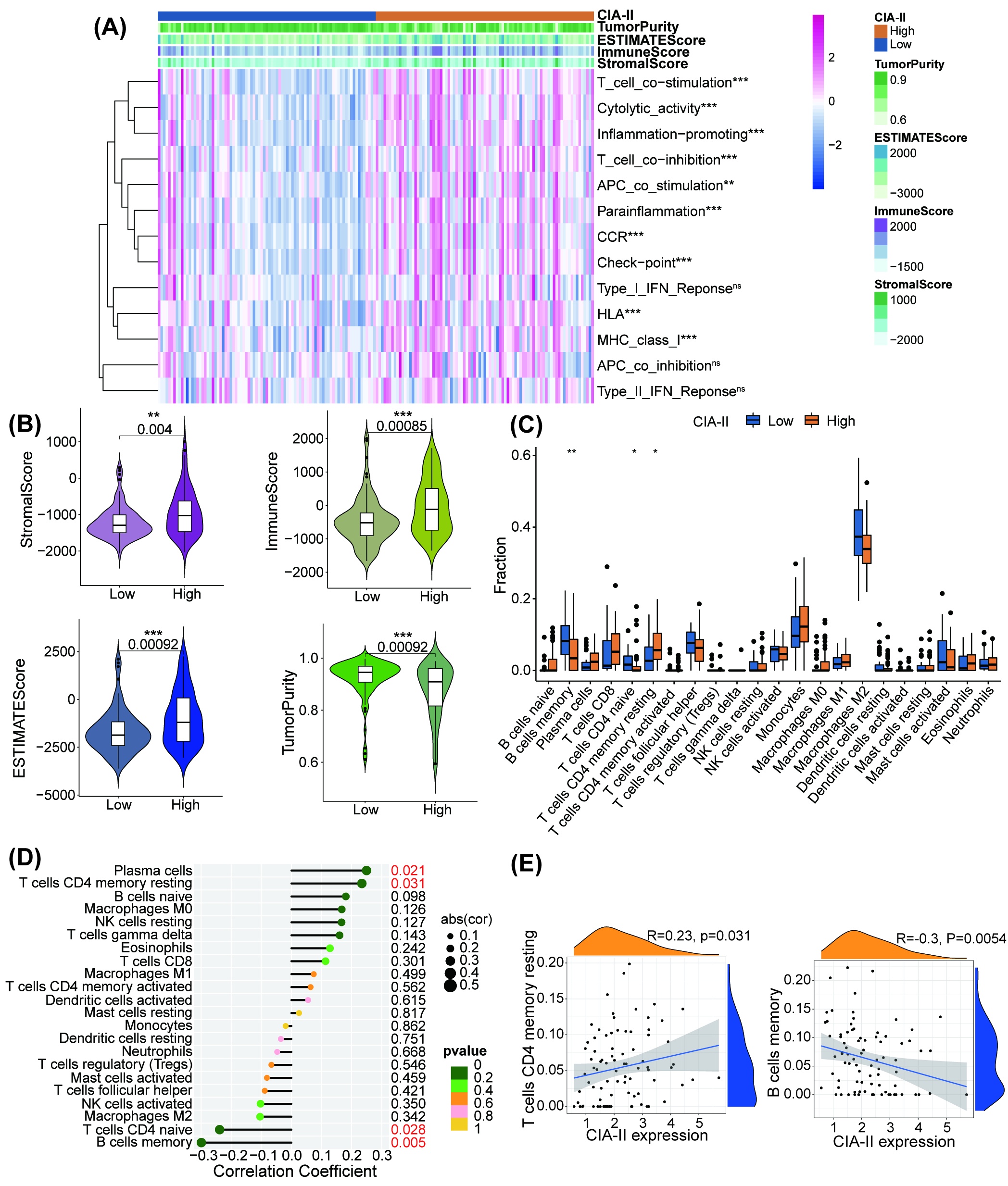Given that the results of the GO‐BP enrichment analysis were linked to T‐cell proliferation, leukocyte proliferation, and leukocyte cell–cell adhesion, we further detected the interrelation between CIA‐II expression and immune features. The ssGSEA algorithm was employed to inspect the enrichment of 13 immune‐connected indicators. As shown in the heatmap in Figure 6, most immune‐related features, including checkpoint, T‐cell costimulation, and inflammation‐promoting, were positively associated with CIA‐II expression in the TCGA (Figure 6A) and CGGA datasets (Figure S4A). We executed the ESTIMATE algorithm to measure the stromal, immune scores, tumor purity, and ESTIMATE in the two subgroups. The results revealed that, in TCGA (Figure 6B) and CGGA (Figure S4B) cohorts, the ESTIMATE, stromal, and immune scores were higher in high‐CIA‐II subtype than in low‐CIA‐II subtype, whereas the opposite was observed for the tumor purity score. Moreover, we employed the CIBERSORT algorithm to investigate the differences in TIIC abundance between the two subtypes in patients with LGG. As shown in the box plots in Figure 6C and the lollipop plots in Figure 6D, in TCGA dataset, the levels of infiltration of M1 macrophages, resting memory CD4+ T cells, and activated memory CD4+ T cells were positively related to CIA‐II expression whereas memory B cell, M2 macrophage, and activated mast cell infiltration levels were inversely correlated with CIA‐II expression. Analogical results were acquired in the CGGA dataset (Figure S4C,D). To better understand immune cell infiltration, we implemented a correlation analysis between CIA‐II expression and infiltration of TIICs in TCGA (Figure 6E) and CGGA (Figure S4E) datasets. These results clearly ascertained that CIA‐II expression was tightly linked to immune cell infiltration in patients with LGG.