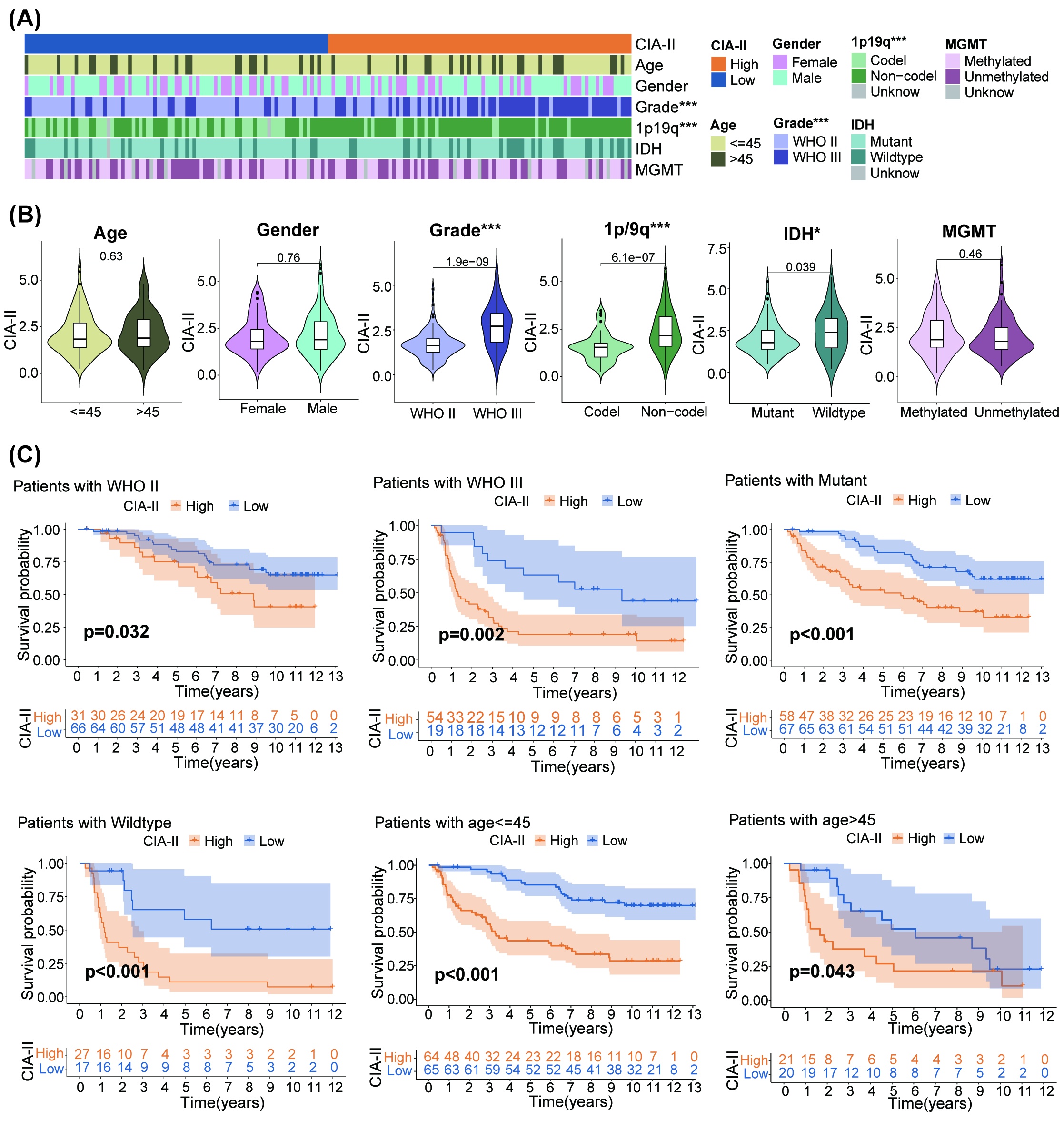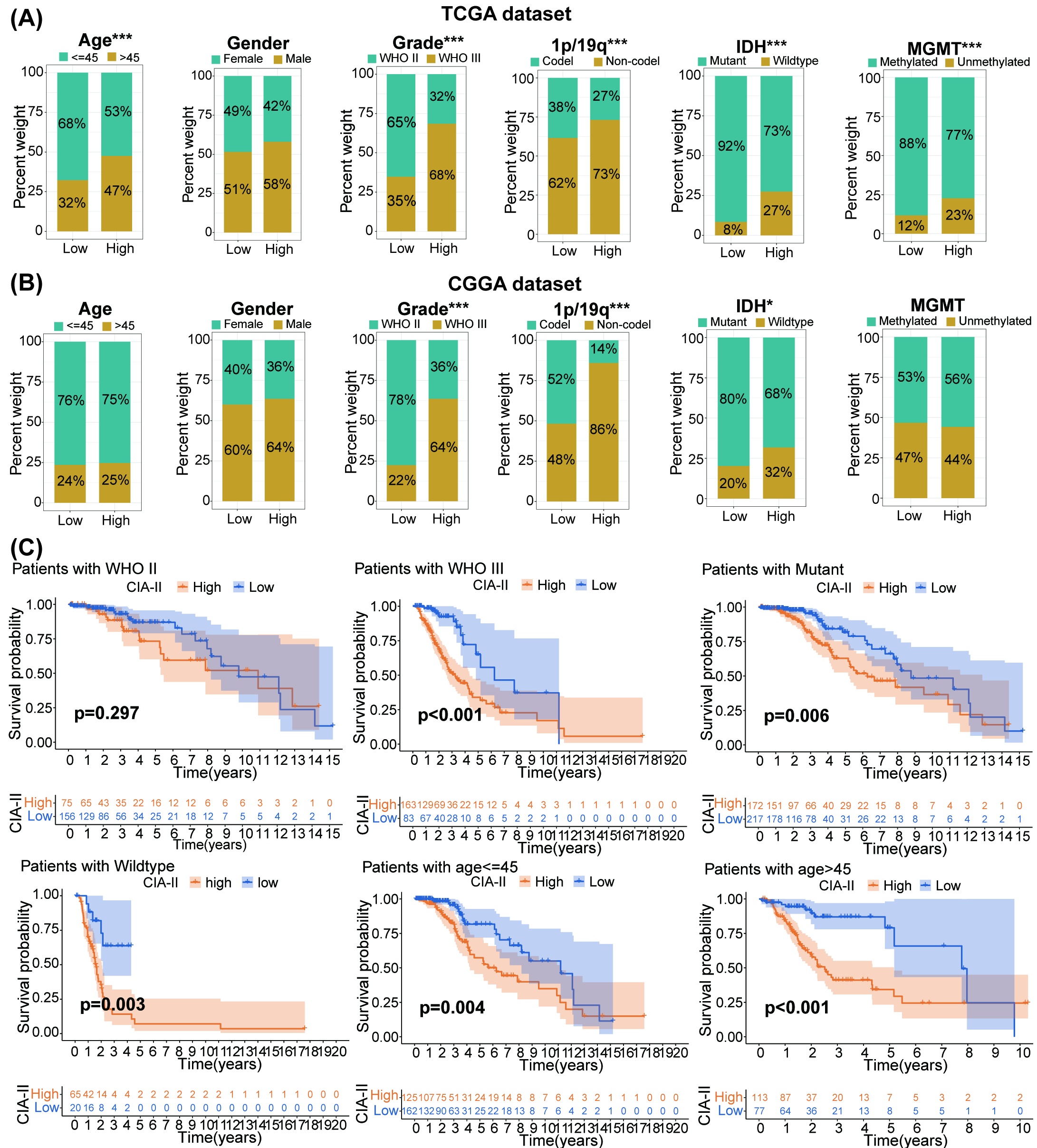 We detected the connection between the CIA‐II expression level and clinical traits (age, gender, WHO grade, isocitrate dehydrogenase [IDH] mutation status, 1p/19q codeletion status, and 6‐O‐methylguanine‐DNA methyltransferase [MGMT] promoter methylation status) in LGG. We found that higher CIA‐II expression was tightly interrelated with higher WHO grade, IDH wildtype status, unmethylated MGMT promoter status, older age, and 1p/19q noncodeletion status in TCGA cohort (Figure 3A,B). Elevated CIA‐II expression was also found to be correlated with higher WHO grade, 1p/19q noncodeletion status, and IDH wildtype status in CGGA cohort (Figure S1A,B). Moreover, we further evaluated the clinical characteristics of LGG patients between the two subsets in both TCGA (Figure S2A) and CGGA (Figure S2B) datasets. These results confirmed that CIA‐II had considerable correlations with the clinical traits of LGG patients.