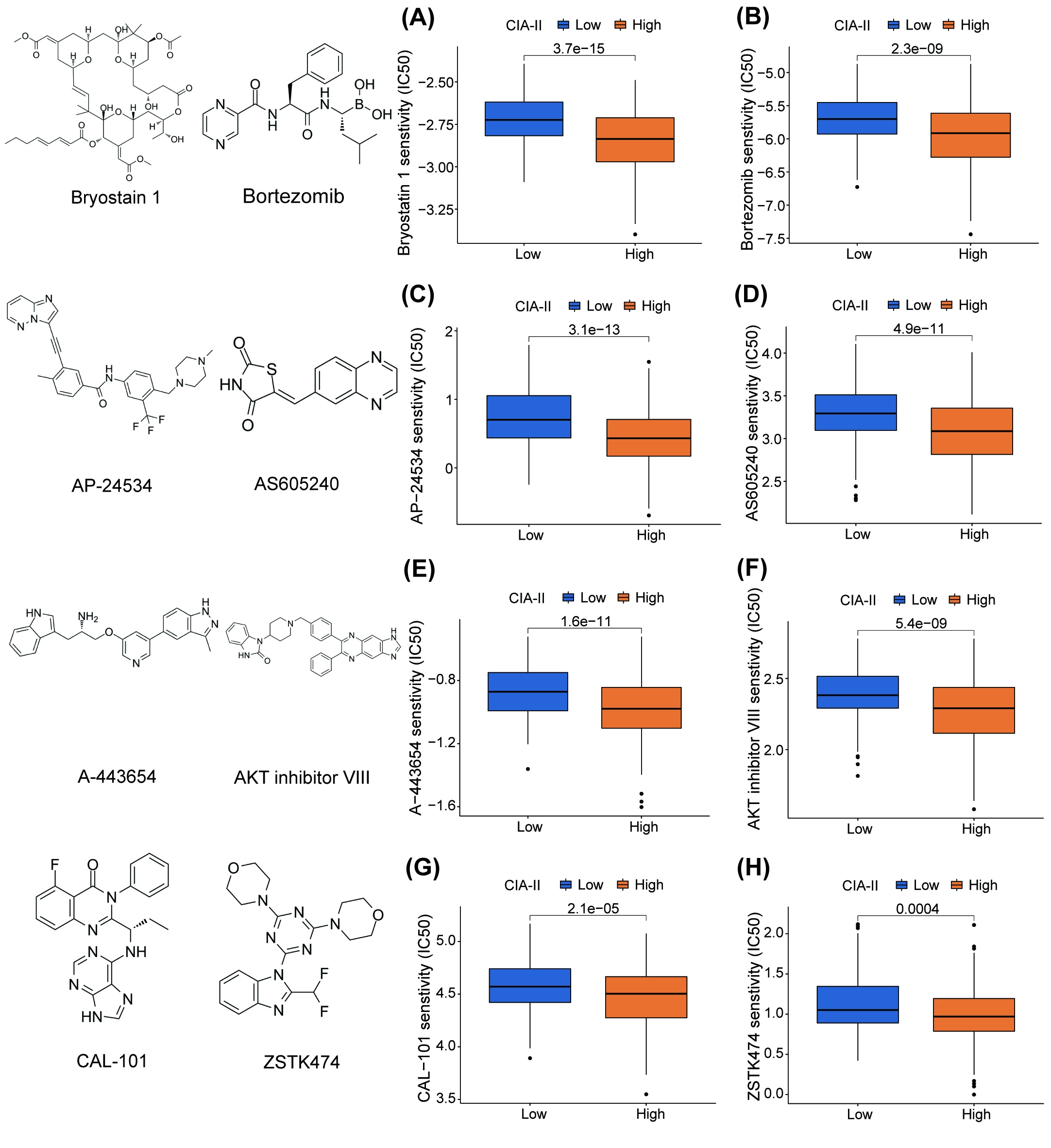 The R package “pRRophetic” was employed to inspect the differences in sensitivity to several chemotherapeutic drugs, such as the PI3K/AKT inhibitors A‐443654, AKT inhibitor VIII, AS605240, ZSTK474, and CAL‐101; the MAPK inhibitor AP‐24534; the proteasome inhibitors bryostain 1 and bortezomib, between the low‐CIA‐II and high‐CIA‐II subtypes.ref. cns14340-bib-0023