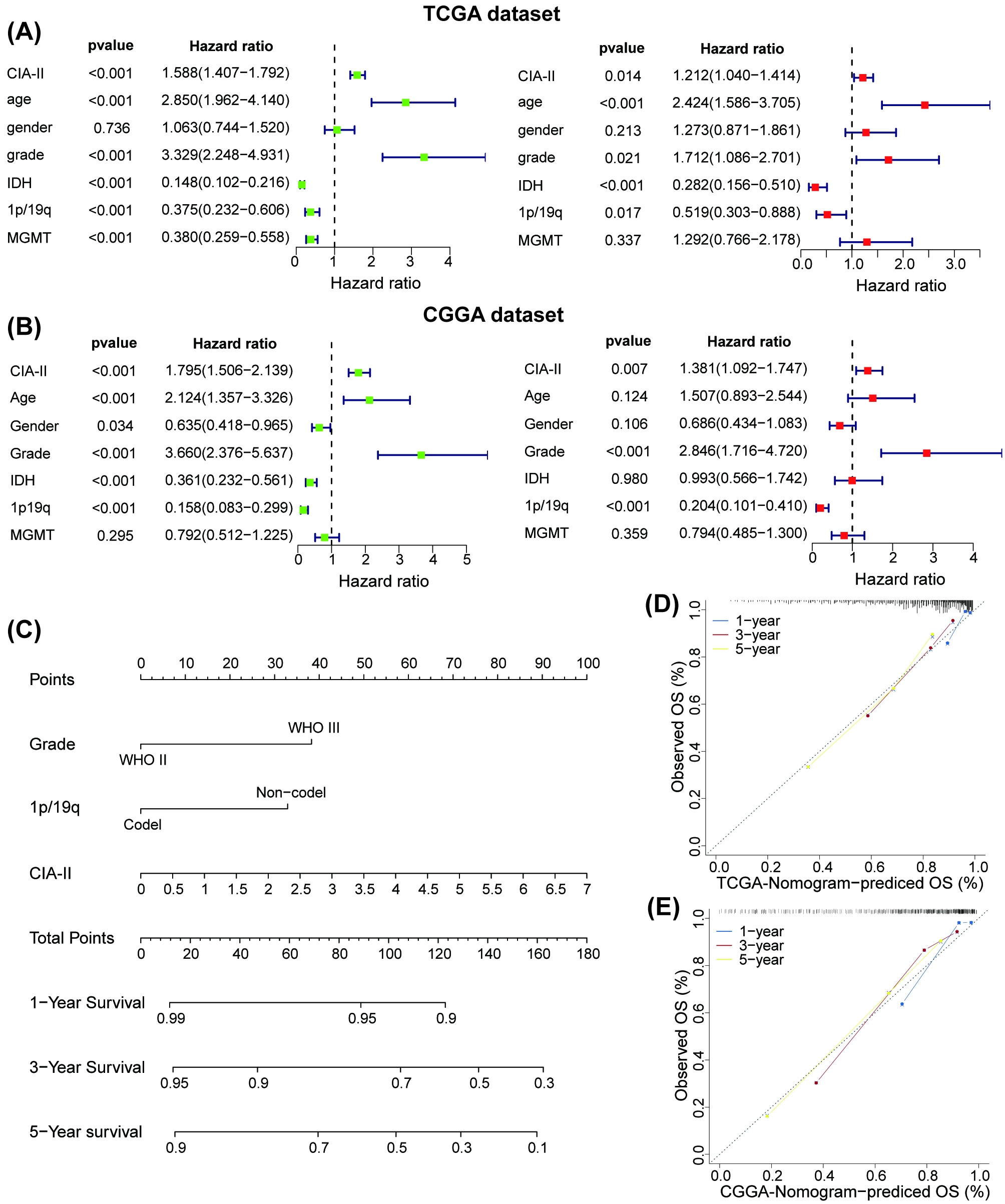 To identify the potential clinical prognostic ability of CIA‐II in LGG, we established a nomogram model using CIA‐II expression, WHO grade, and 1p/19q status data obtained with the common results of the multivariate Cox regression analyses in both TCGA and CGGA datasets (Figure S3C). The calculated scores were used for forecasting 1/3/5‐year OS among LGG patients and a calibration plot was employed to examine the exactness of the nomogram model in estimating the prognosis. The results demonstrated that the nomogram model possessed a high precision in forecasting 1/3/5‐year OS in LGG patients (Figure S3D,E). These findings demonstrated that the established nomogram model may be implemented to accurately estimate the prognosis of LGG patients.