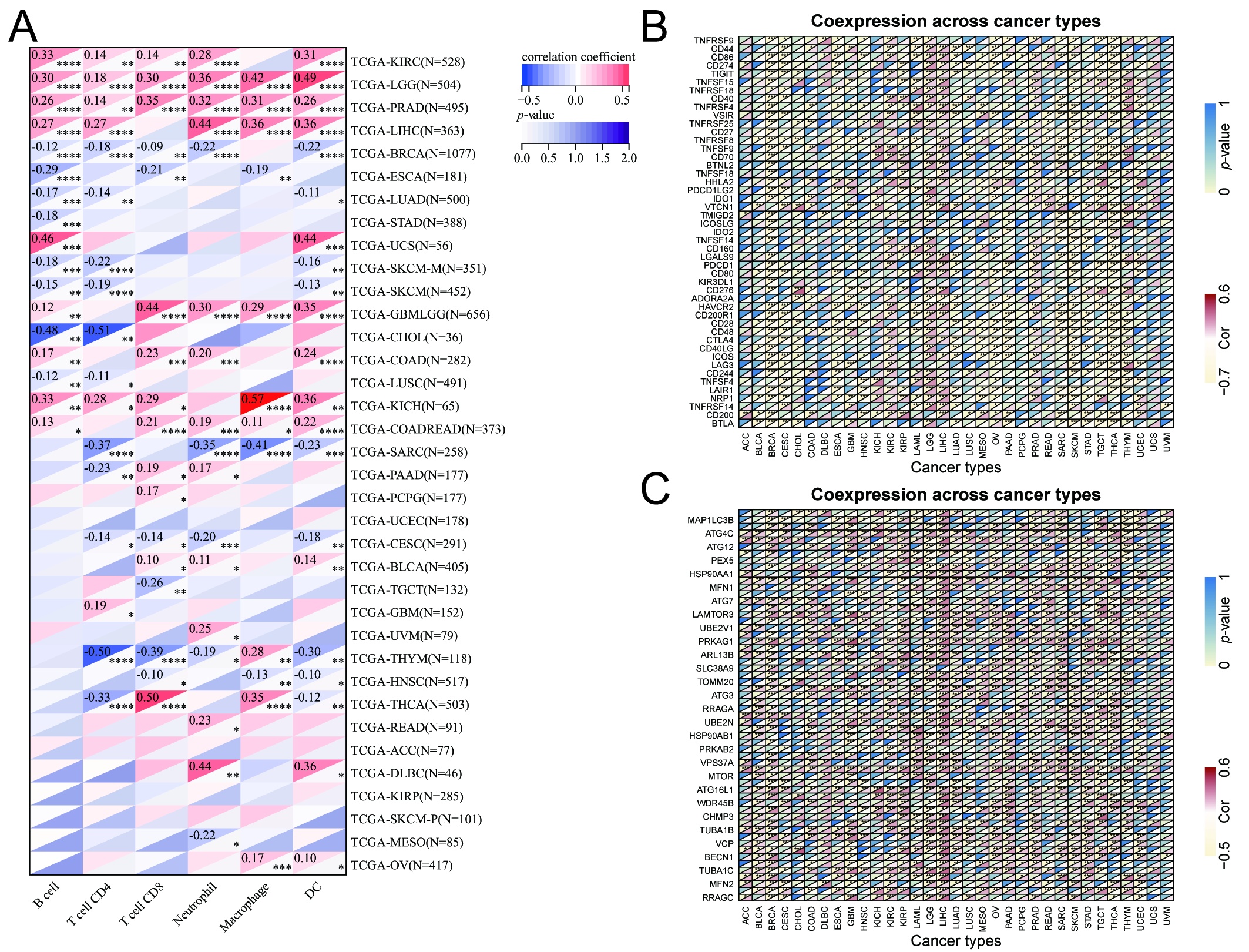 - <bold>Correlation analysis.</bold> (A) Correlation analysis between NRAV and immune cell infiltration in pan-cancer. (B) Correlation analysis between the expression of NRAV and immune checkpoint inhibitors. (C) Coexpression analysis of NRAV expression and autophagic-related molecules. *<italic toggle="yes">p</italic><0.05; **<italic toggle="yes">p</italic><0.01; ***<italic toggle="yes">p</italic><0.001, ****<italic toggle="yes">p</italic><0.0001. (TIF)