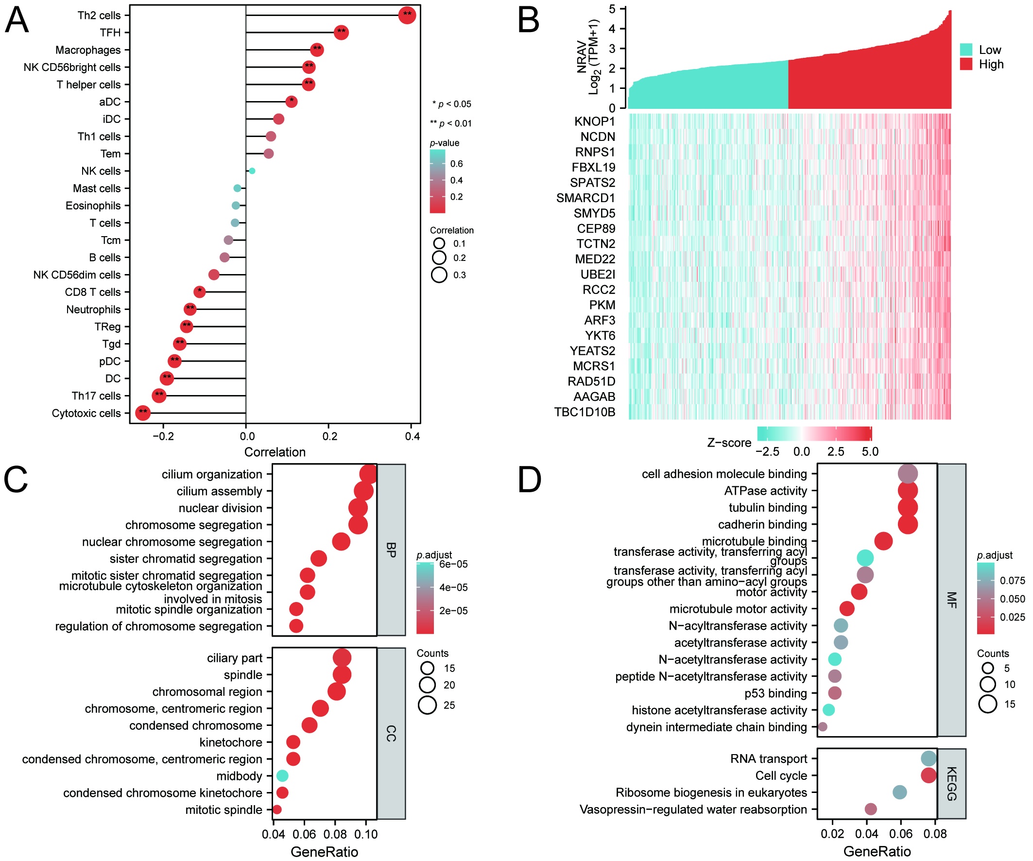 Using a single-sample gene set enrichment analysis (ssGSEA) algorithm, we detected 24 types of immune cells infiltration from 374 TCGA-LIHC samples. Results revealed significant positive correlations between NRAV and Th2 cells, TFH, macrophages, NK CD56 bright cells, and T helper cells. While Cytotoxic cells, Th17 cells, DC, pDC, Tgd, Treg, Neutrophils and CD8 T cells presented significant negative correlation with NRAV expression in HCC (Suppl. Fig. S3A). Further, gene expression correlation analysis identified 74 related genes based on the following criteria: cor-pearson > 0.6 and p-value < 0.001. Finally, a heatmap was constructed to visualize the correlation between NRAV expression and the top 20 co-expression genes (Suppl. Fig. S3B).