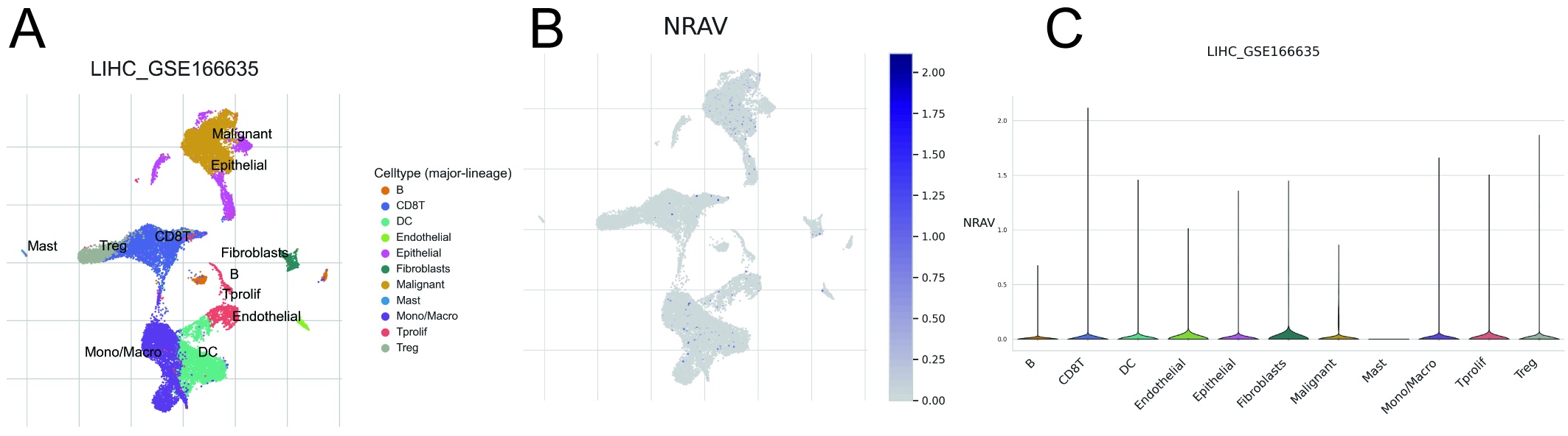 - Single-cell expression of NRAV in hepatocellular carcinoma. (A) The distribution of cell types in LIHC GSE166635 cohort. (B, C) The single cell expression of NRAV in GSE166635 cohort. (TIF)