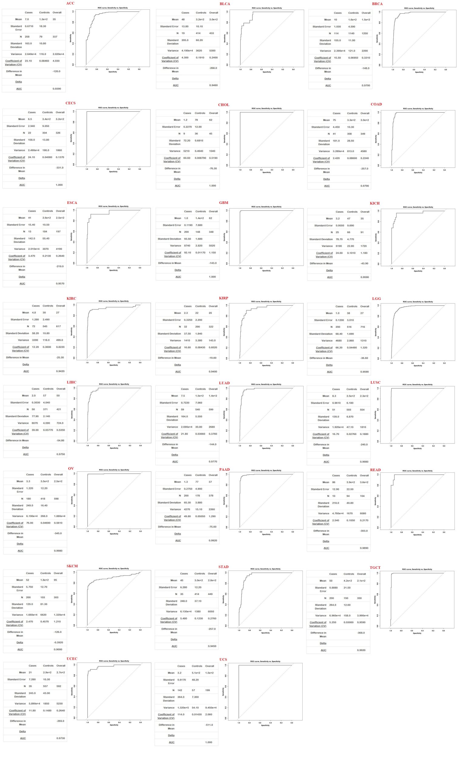 - Figure S2. Diagnostic value of UBE2C in different types of cancer. UBE2C can be a diagnostic factor in CESC, CHOL, GBM, and UCS with AUC = 100%, and ACC, BLCA, BRCA, COAD, ESCA, KICH, KIRC, KIRP, LGG, LIHC, LUAD, LUSC, OV, PAAD, READ, SKCM, STAD, TGCT, and UCEC with AUC ≥90%. ACC, Adrenocortical Carcinoma, BLCA: Bladder Urothelial Carcinoma, BRCA: Breast Invasive Carcinoma, CESC: Cervical squamous cell carcinoma and endocervical adenocarcinoma, CHOL: Cholangiocarcinoma, TGCT: Testicular Germ Cell Tumors, COAD: Colon adenocarcinoma, ESCA: Esophageal carcinoma, GMB: Glioblastoma multiforme, KICH: Kidney Chromophobe, KIRC: Kidney Renal Clear Cell Carcinoma, KIRP: Kidney Renal Papillary Cell Carcinoma, LGG: Low Grade Glioma, LIHC: Liver Hepatocellular Carcinoma, LUAD: Lung Adenocarcinoma, LUSC: Lung Squamous Cell Carcinoma, OV: Ovarian Serouscystadeno Carcinoma, PAAD: Pancreatic Adenocarcinoma, UCEC: Uterine Corpus Endometrial Carcinoma, READ: Rectum adenocarcinoma, SKCM: Skin Cutaneous Melanoma, STAD: Stomach adenocarcinoma, UCS: Uterine Carcinosarcoma. (JPG)