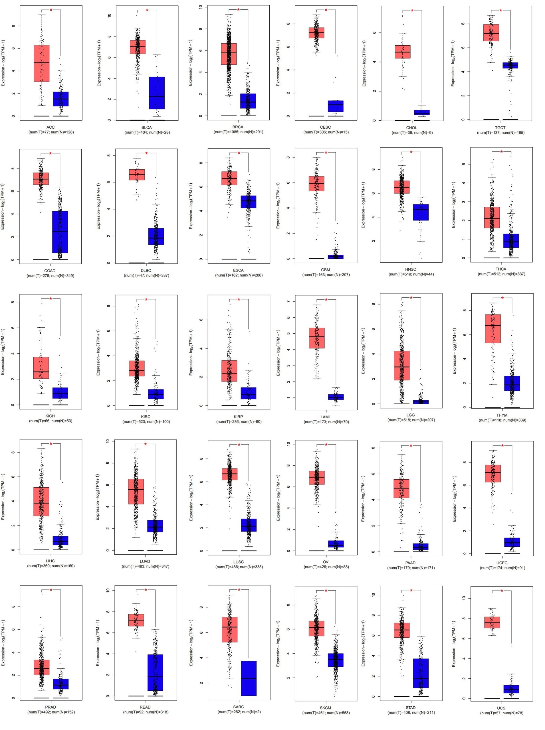 - Figure S1. UBE2C gene expression in different cancer types. With p value <.01 and |LogFC| >1, UBE2C was up‐regulated in 30 types of cancer. ACC, Adrenocortical Carcinoma, BLCA: Bladder Urothelial Carcinoma, BRCA: Breast Invasive Carcinoma, CESC: Cervical squamous cell carcinoma and endocervical adenocarcinoma, CHOL: Cholangiocarcinoma, TGCT: Testicular Germ Cell Tumors, COAD: Colon adenocarcinoma, DLBC: Lymphoid Neoplasm Diffuse Large B‐cell Lymphoma, ESCA: Esophageal carcinoma, GMB: Glioblastoma multiforme, HNSC: Head and Neck squamous cell carcinoma, THCA: Thyroid Carcinoma, KICH: Kidney Chromophobe, KIRC: Kidney Renal Clear Cell Carcinoma, KIRP: Kidney Renal Papillary Cell Carcinoma, LAML: Acute Myeloid Leukemia, LGG: Low Grade Glioma, THYM: Thymoma, LIHC: Liver Hepatocellular Carcinoma, LUAD: Lung Adenocarcinoma, LUSC: Lung Squamous Cell Carcinoma, OV: Ovarian Serouscystadeno Carcinoma, PAAD: Pancreatic Adenocarcinoma, UCEC: Uterine Corpus Endometrial Carcinoma, PRAD: Prostate adenocarcinoma, READ: Rectum adenocarcinoma, SARC: Sarcoma, SKCM: Skin Cutaneous Melanoma, STAD: Stomach adenocarcinoma, UCS: Uterine Carcinosarcoma. (JPG)