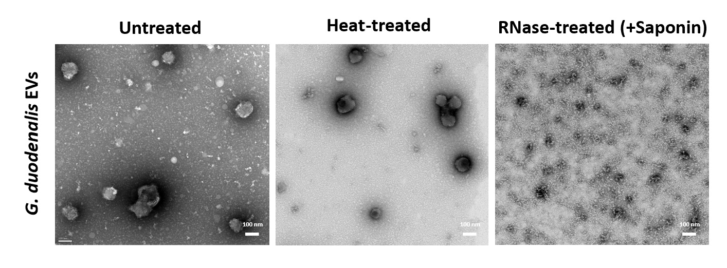 Untreated, heat‐treated, and RNase‐treated G. duodenalis isolate NF EVs were analysed by transmission electron microscopy (TEM) negative staining. EV samples were placed on formvar Carbon grids. Grids were placed onto droplets of 1% glutaraldehyde for 1 min and washed three times for 1 min with drops of double‐distilled H2O. Next, grids were stained with 1% uranyl acetate for 1 min and dried for 30 min. This process was repeated one time. Dry grids were visualised using an FEI Tecnai G2 Spirit Twin transmission electron microscope (120 kV Cryo‐TEM) and Gatan Ultrascan 4000 4k × 4k CCD Camera System (Model 895) at the McGill University Facility for Electron Microscopy Research.
