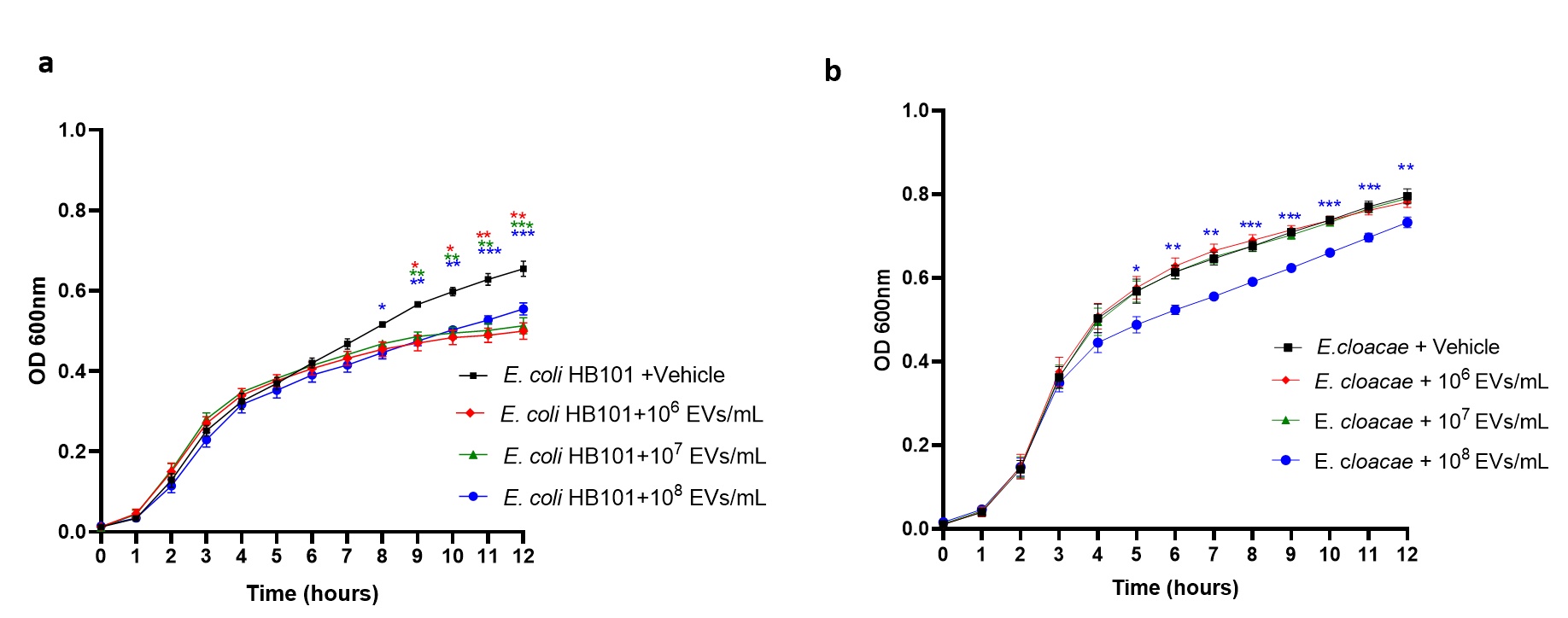 Further experiments also demonstrated that Giardia EVs inhibit the growth of bacteria by exhibiting bacteriostatic effects against E. coli HB101 at 106 EVs/mL (p < 0.01), 107 EVs/mL (p < 0.001), and 108 EVs/mL (p < 0.001) concentrations. Higher concentrations (108 EVs/mL) of G. duodenalis EVs also induced bacteriostasis in E. cloacae TW1 (p < 0.01), while no effects were observed with 106 EVs/mL and 107 EVs/mL (Figure S1). Bacteriostatic effects of G. duodenalis EVs were observed at the end of the exponential phase for each isolate.