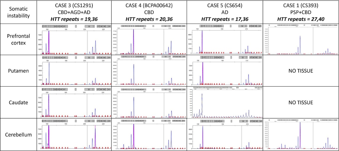 - Figure S3. Analysis of Somatic instability between brain tissues. Capillary electrophoresis of those patients with pathogenic expansions of the CAG HTT repeats. Tissues of the prefrontal cortex, caudate, putamen, and cerebellum were compared. CBD, corticobasal degeneration; AGD, argyrophilic grain disease; PSP, progressive supranuclear palsy; AD, Alzheimer’s disease. (TIF)