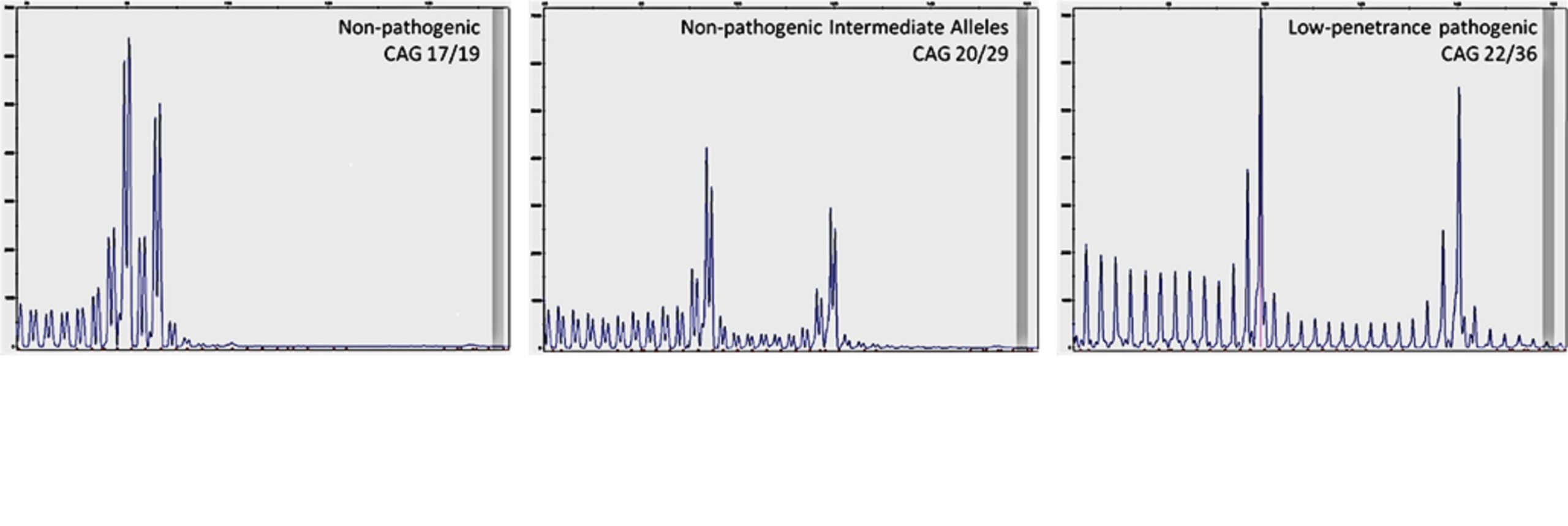 - Figure S1. Representative TP‐PCR electropherograms showing HTT normal, intermediate and expanded CAG alleles. (TIF)