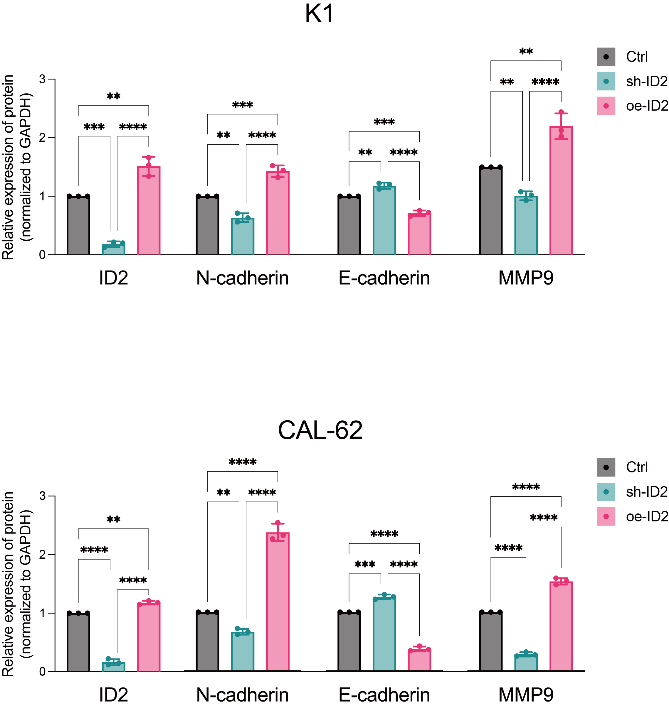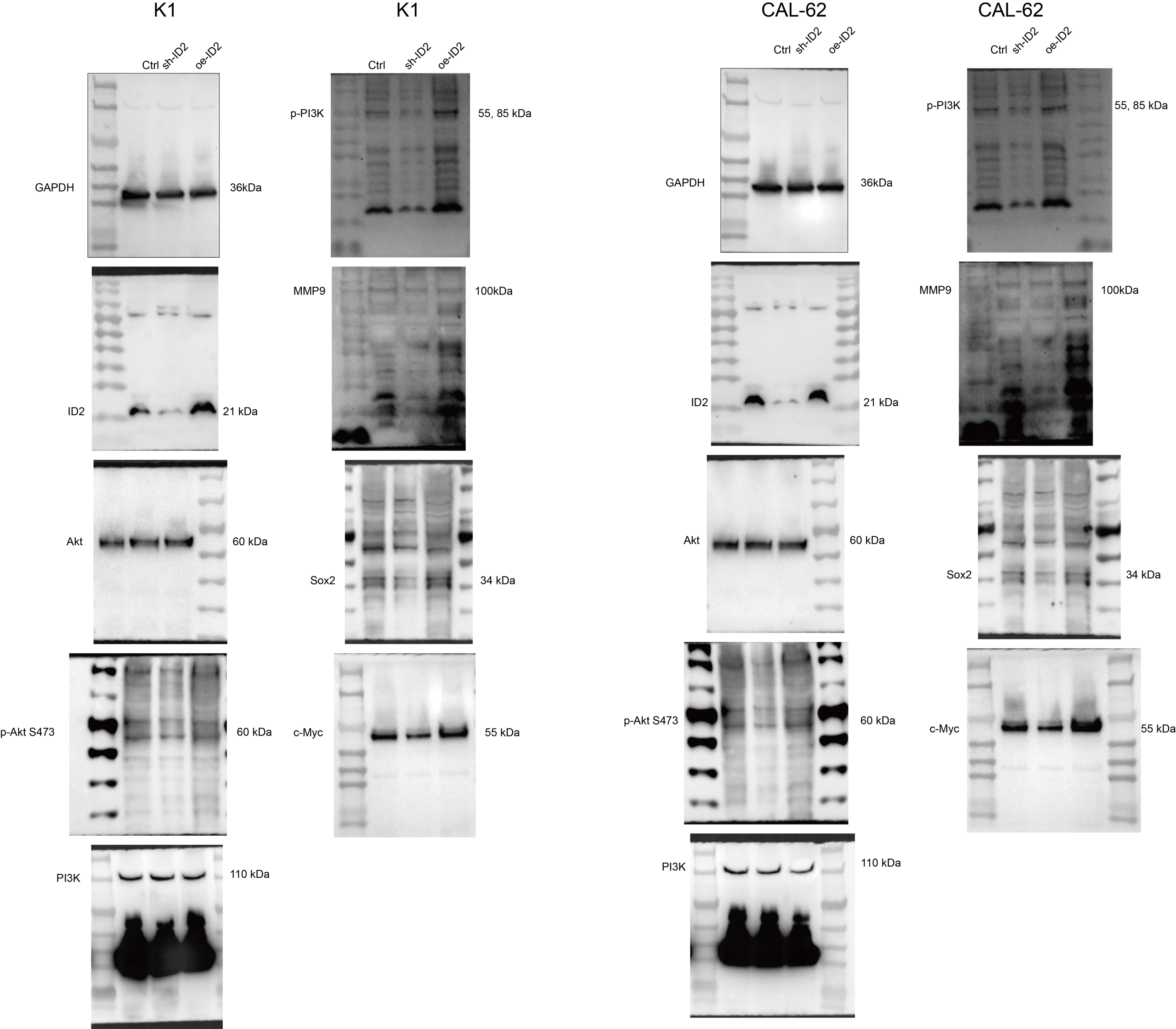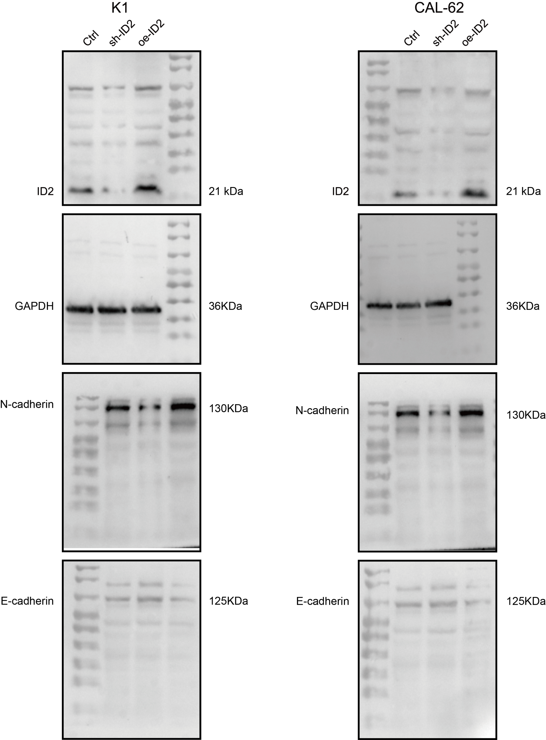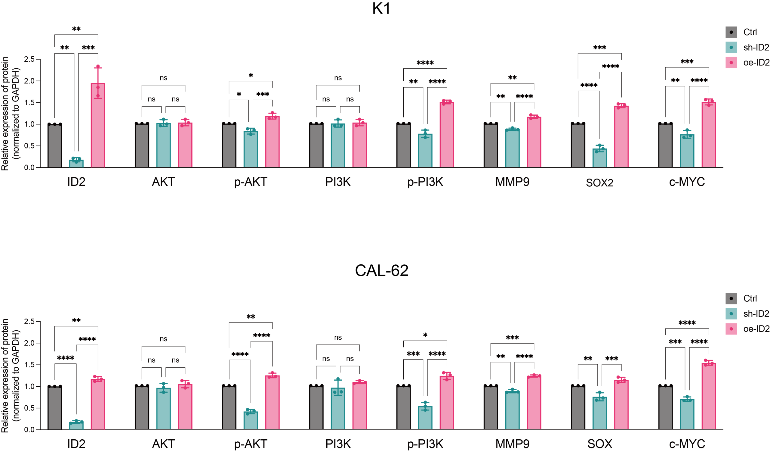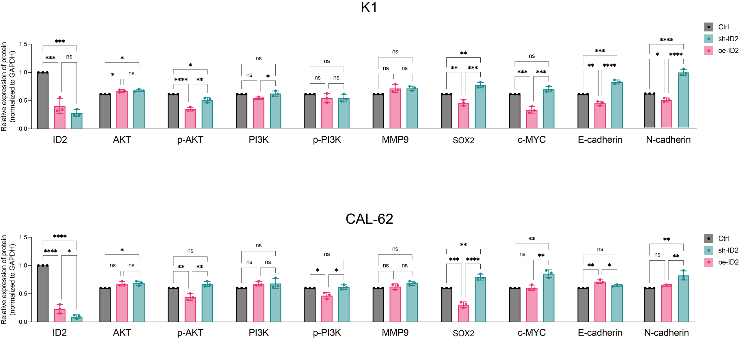 Inhibitor of DNA Binding 2 (ID2) belongs to the ID family of members and is a helix-loop-helix transcription regulator. Its role involves the regulation of crucial biological processes such as cell differentiation, proliferation, and apoptosis. ID proteins are often overexpressed in cancer stem cells, where they regulate the formation of embryonic and adult tissue stem cells. For instance, in prostate cancer, androgens may exert control over proliferation, apoptosis, and tumor suppression through ID1, ID3, ID2, and ID4 [ref. 3, ref. 4]. ID1 overexpression contributes to invasion and tumor progression [ref. 5]. Furthermore, overexpression of ID1 and ID3 leads to reduced expression of cell cycle inhibitors p16, p21, and p27, resulting in increased cell proliferation [ref. 6]. There are also reports linking ID proteins to chemoresistance in cancer cells. ID1 and ID3 regulate the self-renewal of colon cancer stem cells through p21. Concurrent knockout of ID1 and ID3 enhances the sensitivity of cancer stem cells to the chemotherapy drug oxaliplatin [ref. 7]. Related research suggests that ID2 may be dysregulated and play varying roles in the progression of several cancer types. However, the function of ID proteins in thyroid carcinoma remains unknown.
