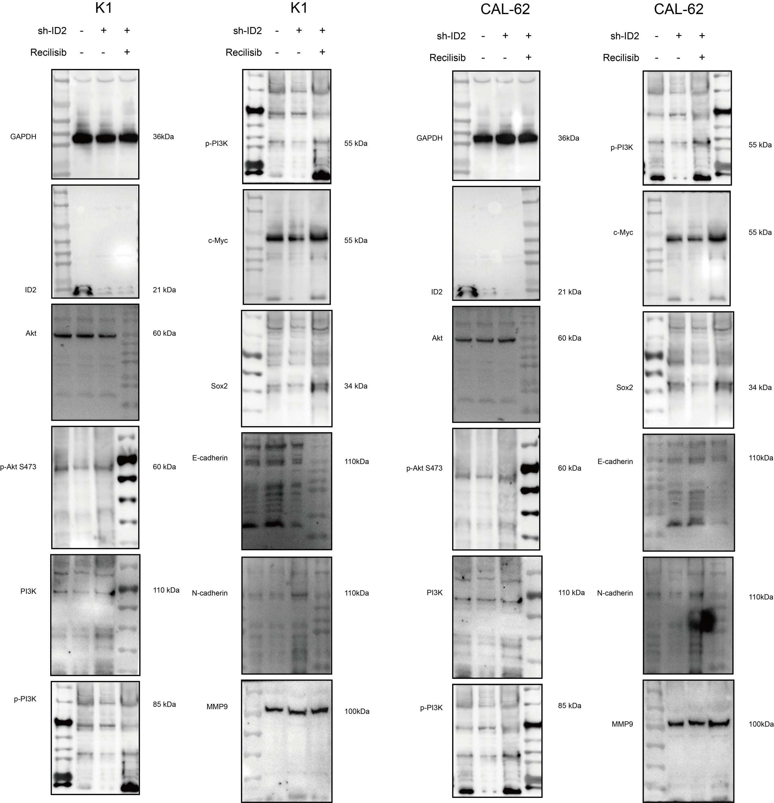 We tested the drug sensitivity (for example IC50) of K1 and CAL-62 with NC and sh-ID2 to some small molecule inhibitors of cancer-related pathways (Fig. 5A). The results showed that PI3K/Akt inhibitors further enhanced the viability loss of sh-ID2 cells. Furthermore, the expression relationship between ID2 and PI3K, AKT1, CTNNB1, CDK4, CDK6, and cyclin D1 were analysed by GEPIA (Fig. 5B). The results indicated that ID2 may be involved in regulating intracellular PI3K/Akt signaling pathways.
