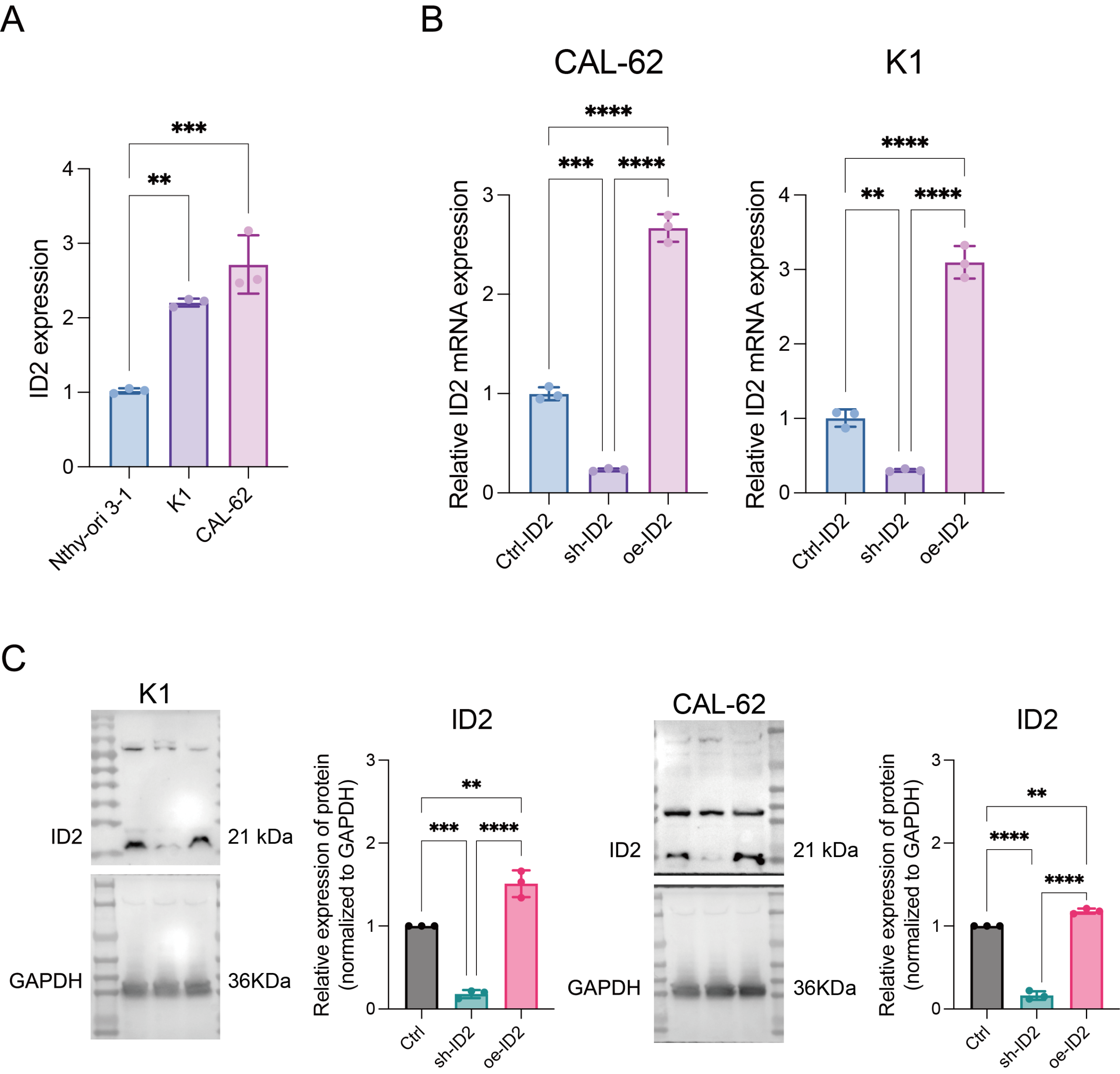 Inhibitor of DNA Binding 2 (ID2) plays a crucial role in tumor cell proliferation, invasion, metastasis, and stemness. Aberrant ID2 expression is associated with poor prognosis in various cancers. However, the specific function of ID2 in thyroid cancer remain unclear.
