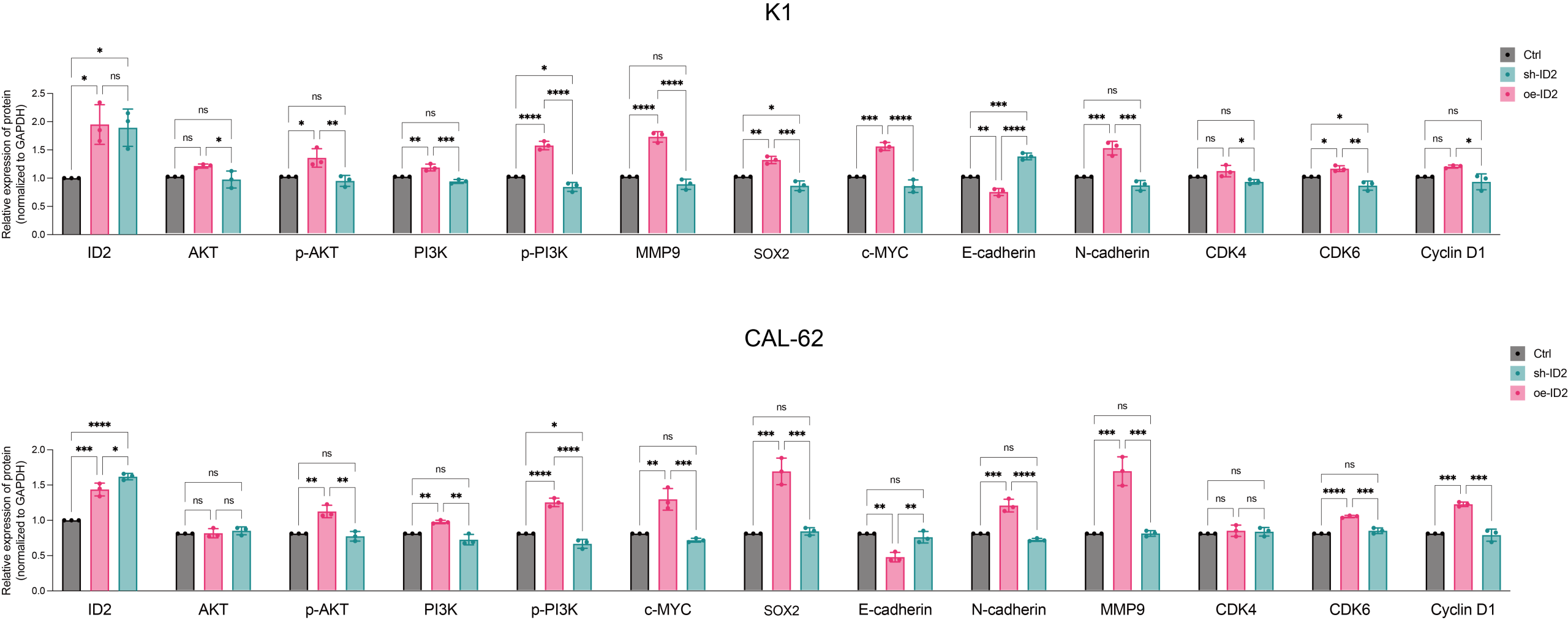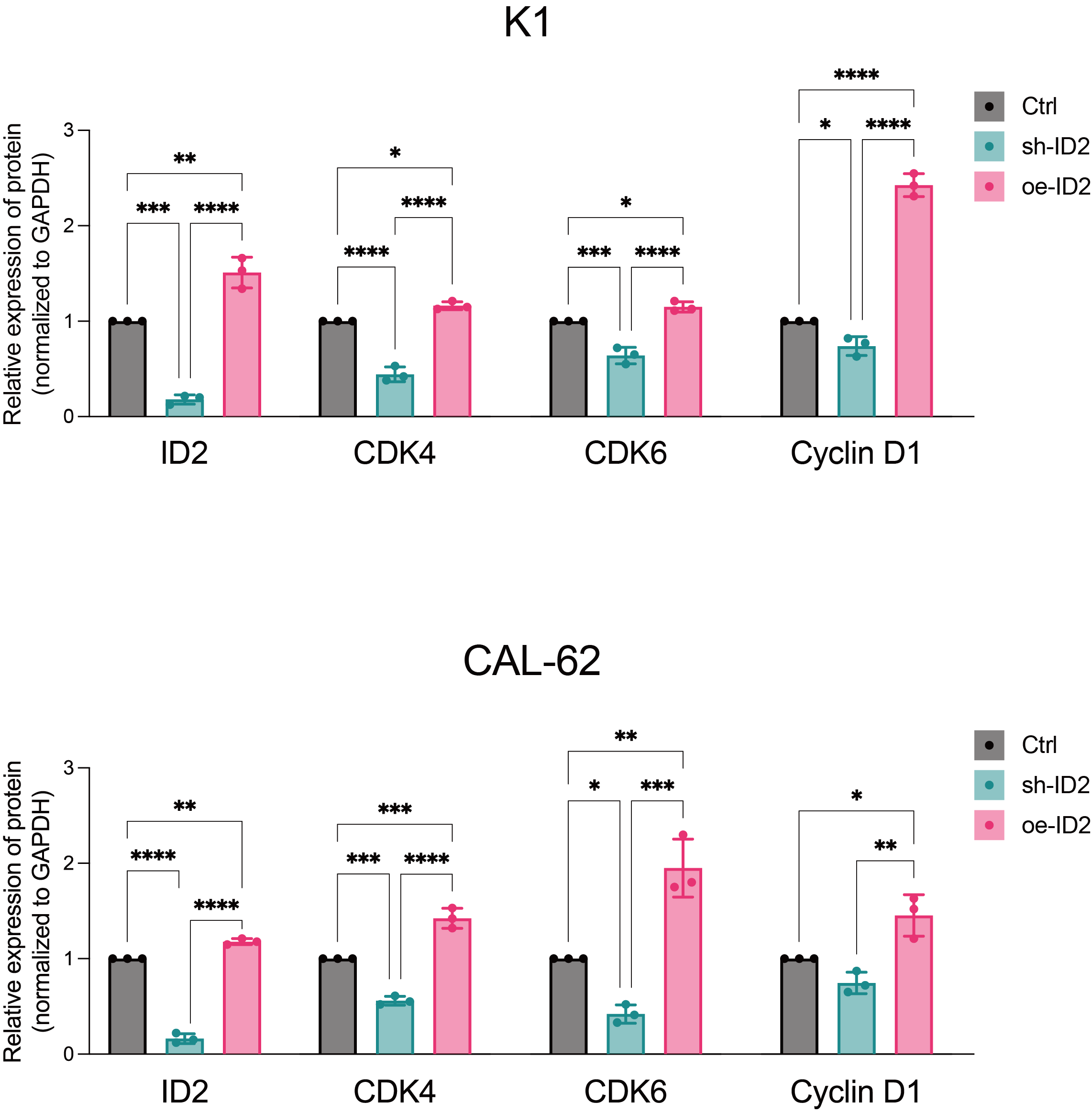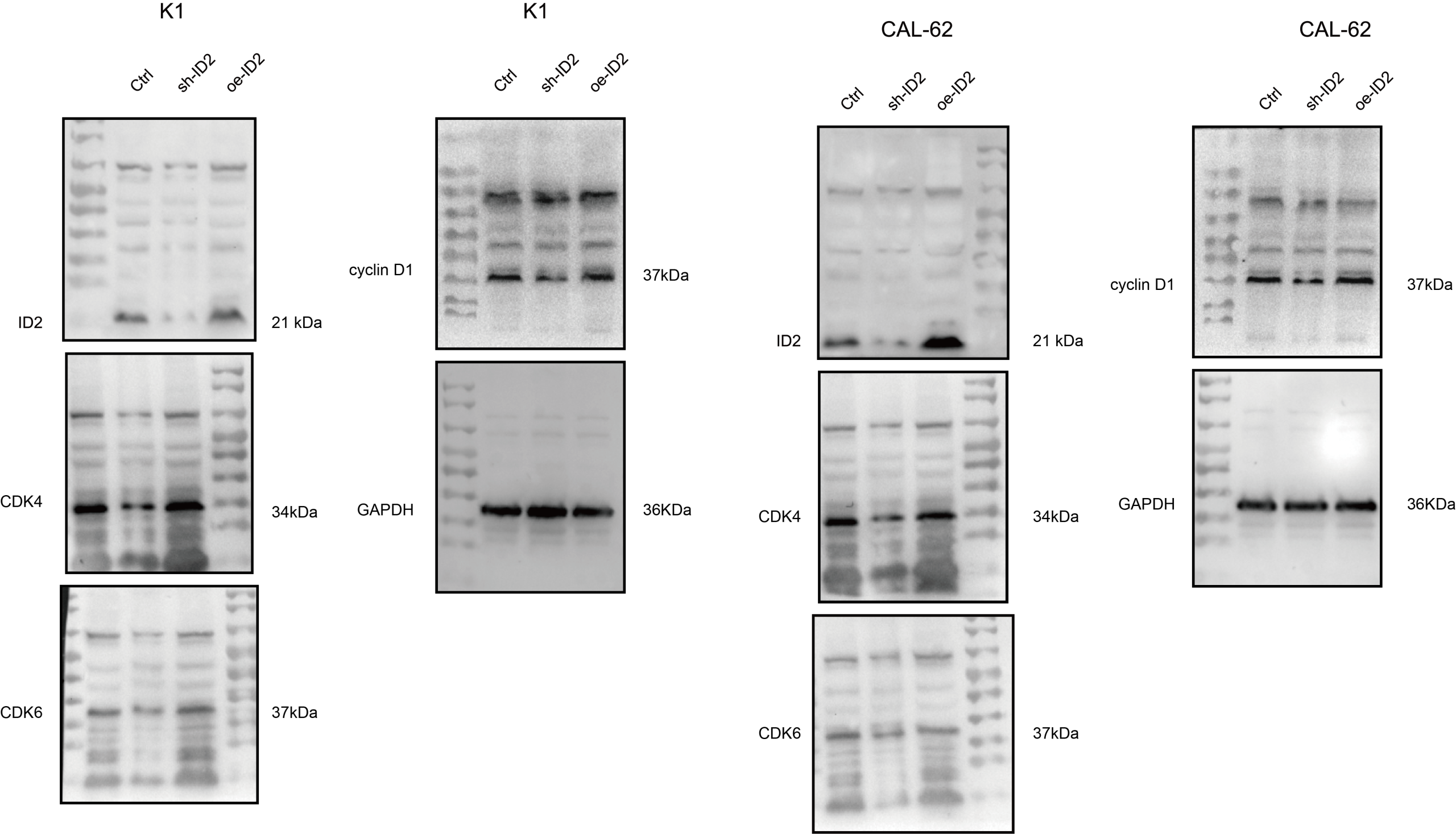 ID2 was highly expressed in two thyroid cancer cell lines (CAL-62 and K1) compared to normal human thyroid epithelial cells (Nthy-ori 3-1) (Fig. S1A). After knockdown and overexpression ID2 in K1 and CAL-62, RT-qPCR and WB were used to confirm the efficacy of ID2 expression regulation (Fig. S1B, C). Over-expression ID2 promoted the proliferation, while ID2 knockdown inhibited the viability and clonogenicity compared to control (Fig. 3A, B). We speculated that ID2 may regulate the cell cycle molecules in thyroid cancer. WB detected protein expression levels of CDK4, CDK6 and cyclin D1, which were key cell cycle proteins for cancer proliferation. Oe-ID2 promoted the expression of CDK4, CDK6 and cyclin D1, while sh-ID2 showed the opposite outcomes (Fig. 3C, D, Fig. S2).