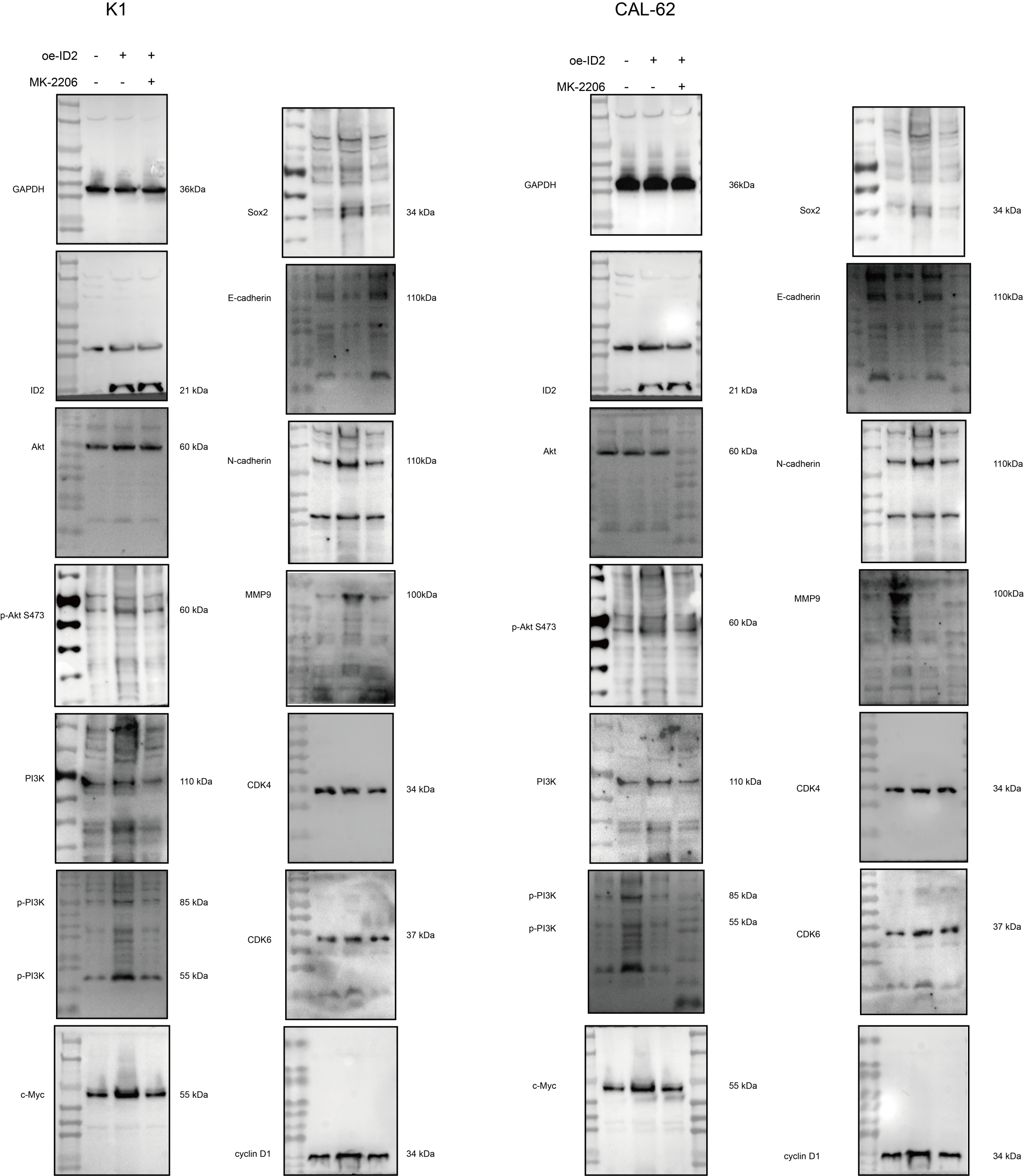 The rabbit normal IgG and antibodies against ID2 (1:1000, A0996), Snail (1:1000, A5243), Phospho-AKT1-S473 (AP0140), c-MYC (1:1000, A19032) were purchased from ABclonal (Wuhan, China). The rabbit normal IgG and antibodies against E-cadherin (1:1000, 20874-1-AP), N-cadherin (1:1000, 22018-1-AP), MMP9 (1:1000, 10375-2-AP), PI3 Kinase p110 alpha (1:1000, 67071-1-Ig), GAPDH (1:2000, 10494-1-AP), Ki67 (1:2000, 27309-1-AP), Pan-keratin (1:2000, 26411-1-AP), and HRP-conjugated secondary antibody (1:10000, SA00001-2) was purchased from proteintech (Shanghai, China). The rabbit normal IgG and antibodies against CDK4 (1:1000, D9G3E), CDK6 (1:1000, D4S8S), cyclin D1 (1:1000, E3P5S), AKT (1:1000, 4691 S) were purchased from CST (Shanghai, China). phospho-PI3 kinase p85/p55 (Tyr467/Tyr199) (1:1000, HY-P80846) and Sox2 (1:1000, HY-P80334) was purchased from MedChemExpress (MCE, Shanghai, China).