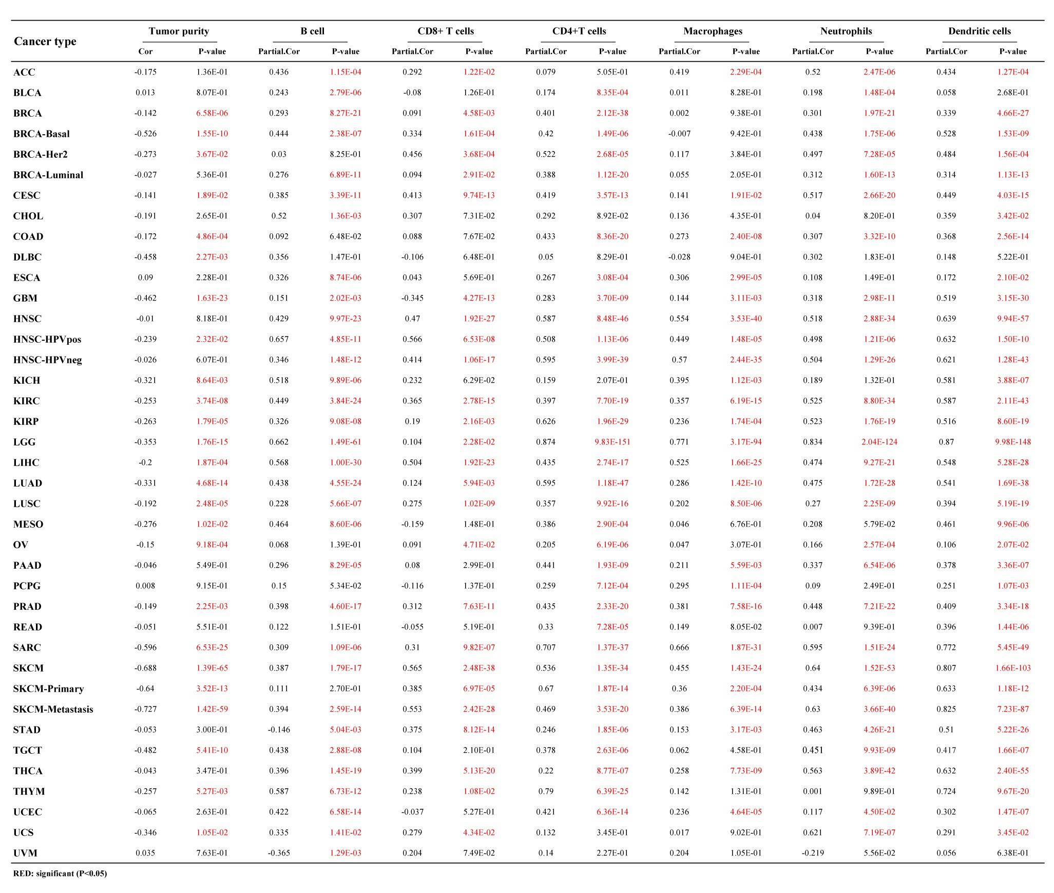 A growing body of evidence suggests that tumor progression and prognosis are closely related to the TME. During tumor progression, a variety of immune cells are recruited into the microenvironment surrounding the tumor cells, infiltrate into the tumor and become tumor immune infiltration20,39,40. In addition, tumor purity is an important factor influencing the analysis of immune infiltration in clinical tumor samples by genomic approaches41, and low tumor purity is an independent risk factor for poor prognosis in some cancer types42,43. To investigate the relationship between ptpn6 expression and tumor immune infiltration, we assessed the correlations between ptpn6 expression and immune infiltration levels in 32 cancer types from TIMER. The results showed that ptpn6 expression was significantly correlated with tumor purity in 21 types of cancer (Table S1). In addition, ptpn6 expression was significantly correlated with infiltrating levels of B cell in 27 types of cancers, CD8 + T cells in 19 types of cancer, CD4 + T cells in 26 types of cancer, macrophages in 21 types of cancer, neutrophils in 23 types of cancer, and dendritic cells in 29 types of cancer (Table S1).