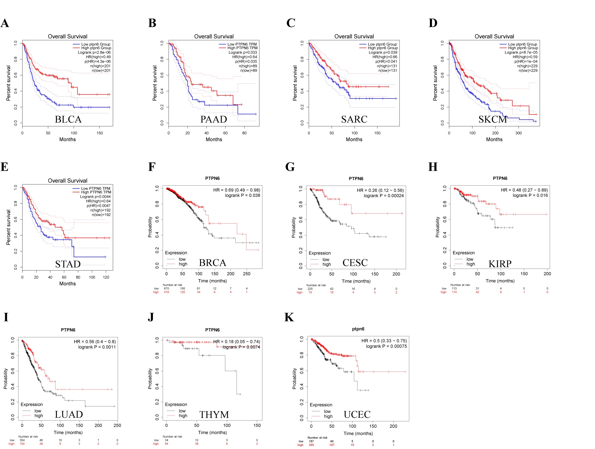 Meanwhile, high ptpn6 expression was correlated with good prognosis in BLCA, PAAD, sarcoma (SARC), SKCM, STAD, BRCA, CESC, KIRP, LUAD, thymoma (THYM) and UCEC from GEPIA2 and Kaplan-Meier plotter database (Fig. 3A, S1-2, all P < 0.05), suggesting the complexity of the correlation between ptpn6 expression and prognosis of different tumor types.