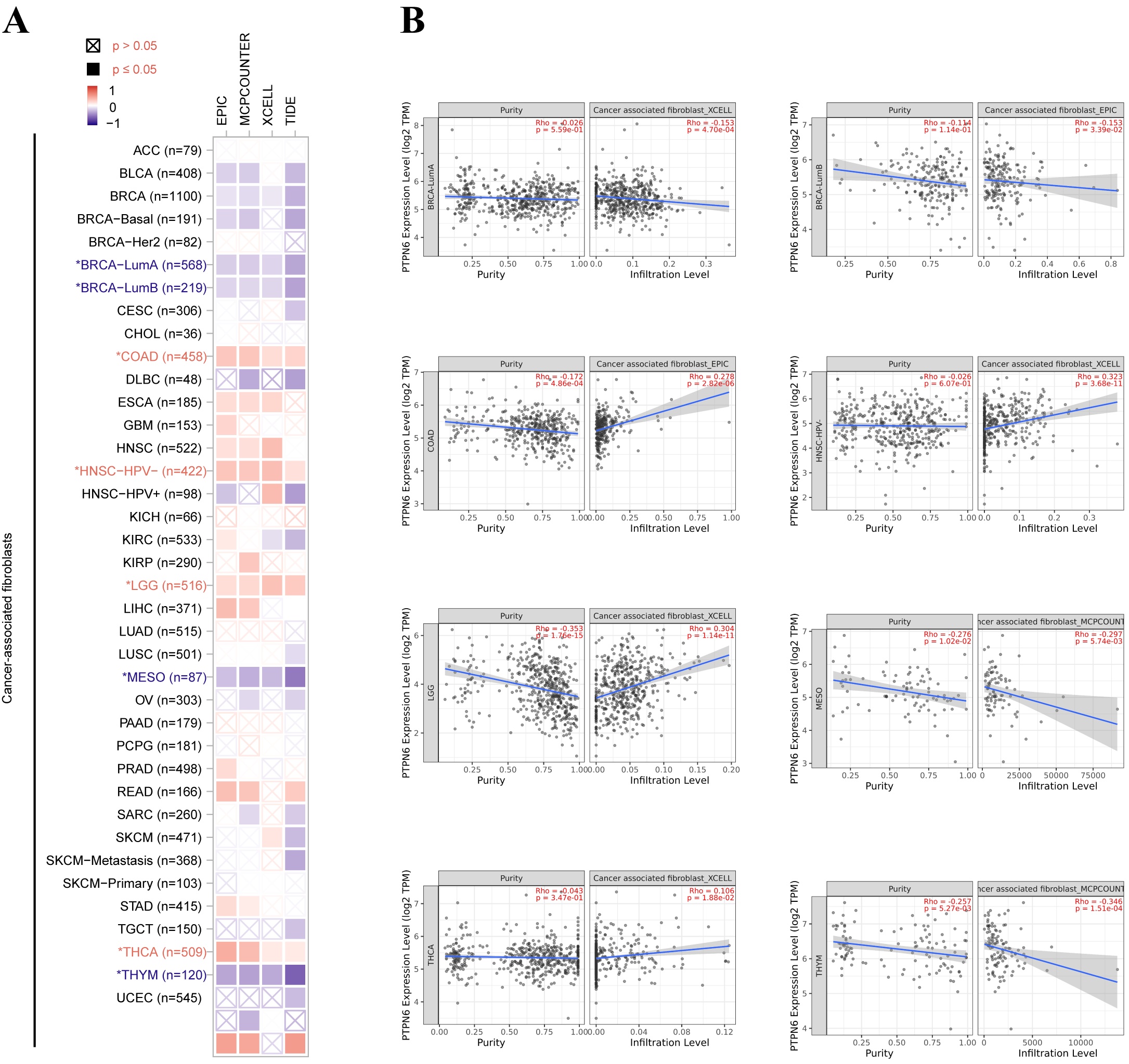 The correlation between ptpn6 expression and immune infiltration in pan-cancer was investigated using TIMER (https://cistrome.shinyapps.io/timer/)27. The tumor purity, B cells, CD8 + T cells, CD4 + T cells, macrophages, neutrophils and dendritic cells were selected. The results were visualized as scatter plots. Heatmaps and scatter plots of the correlation between ptpn6 expression and cancer associated fibroblasts (CAFs) were generated through TIMER228.