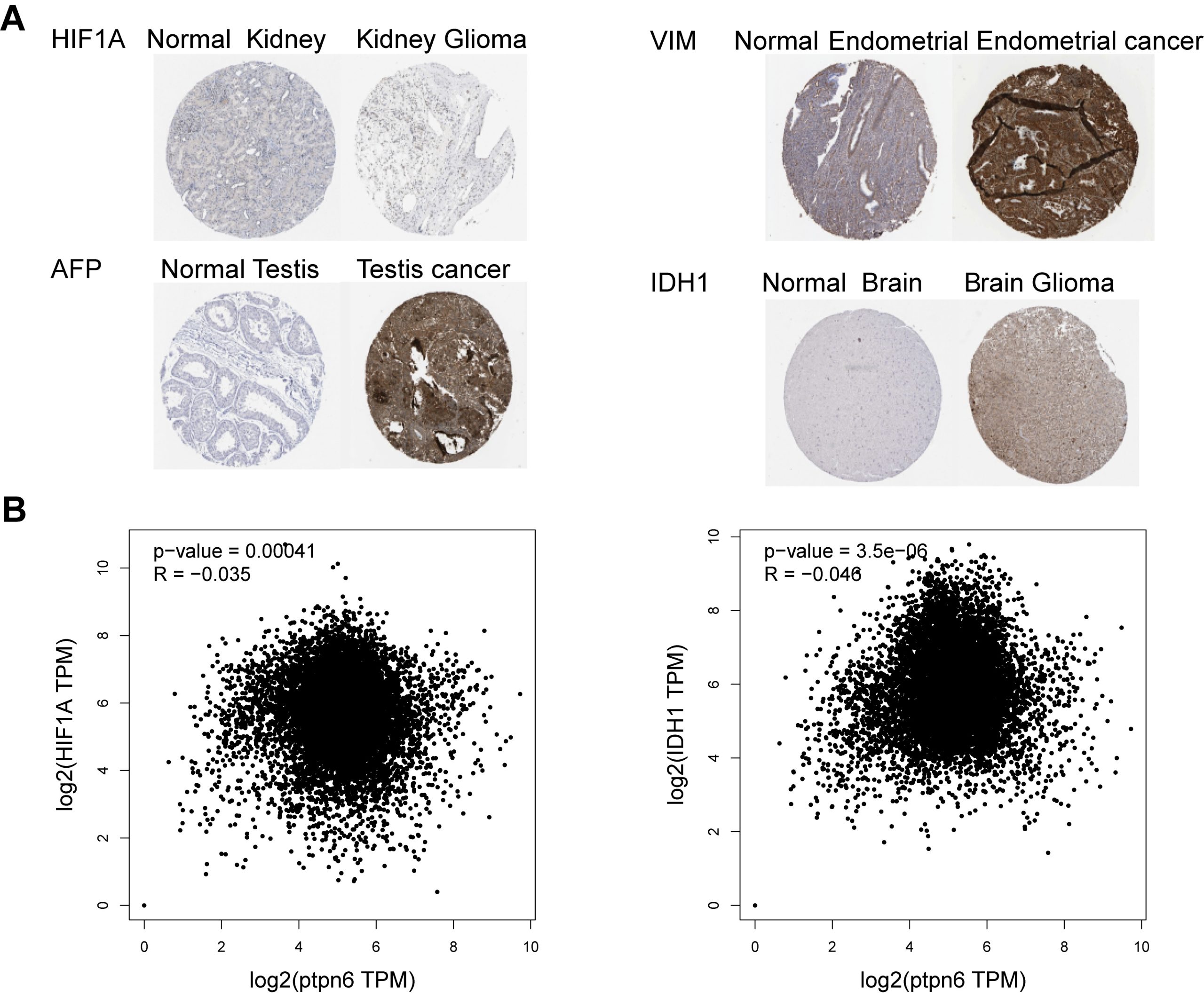 TME features serve as markers for evaluating tumor cell responses to immunotherapy and influence clinical outcomes54. More and more studies have suggested that tumor immune infiltrating cells, including but not limited to B cells, T cells, neutrophils, macrophages, dendritic cell (DC), and tumor associated fibroblast (CAF), are closely associated with the tumor progression. Thus, the associations between ptpn6 expression and immune infiltration levels across 33 types of cancer was explored, and the results showed that ptpn6 expression was significantly associated with tumor immune infiltration in most cancers. Especially in LGG, KIRC, UCS and TGCT, the increased expression of ptpn6 was significantly associated with poor prognosis and high immune infiltration. We further carried out IHC analyses of typical immune markers in kidney cancer, testicular cancer, brain glioma and uterine carcinoma through HPA database, and it revealed that compared with the corresponding non-tumor tissues, the immune markers HIF1A, IDH1, AFP and VIM were highly expressed in these four cancer tissues, respectively (Figure S5A). And ptpn6 expression was significantly correlated with the markers HIF1A and IDH1(Figure S5B). All these suggested that ptpn6 plays a specific role in tumor immunity, such as a key regulatory role in the interaction between cancer cells and various components of TME, thereby affect immune escape of tumors and ultimately tumor proliferation, recurrence, or metastasis. In addition, we also investigated the correlation between CAFs and ptpn6 expression, and found that ptpn6 expression was positively correlated with CAFs in COAD, HNSC-HPV-, LGG and THCA, while negatively correlated with BRCA-LumA/LumB, mesothelioma (MESO) and THYM (Figure S4).