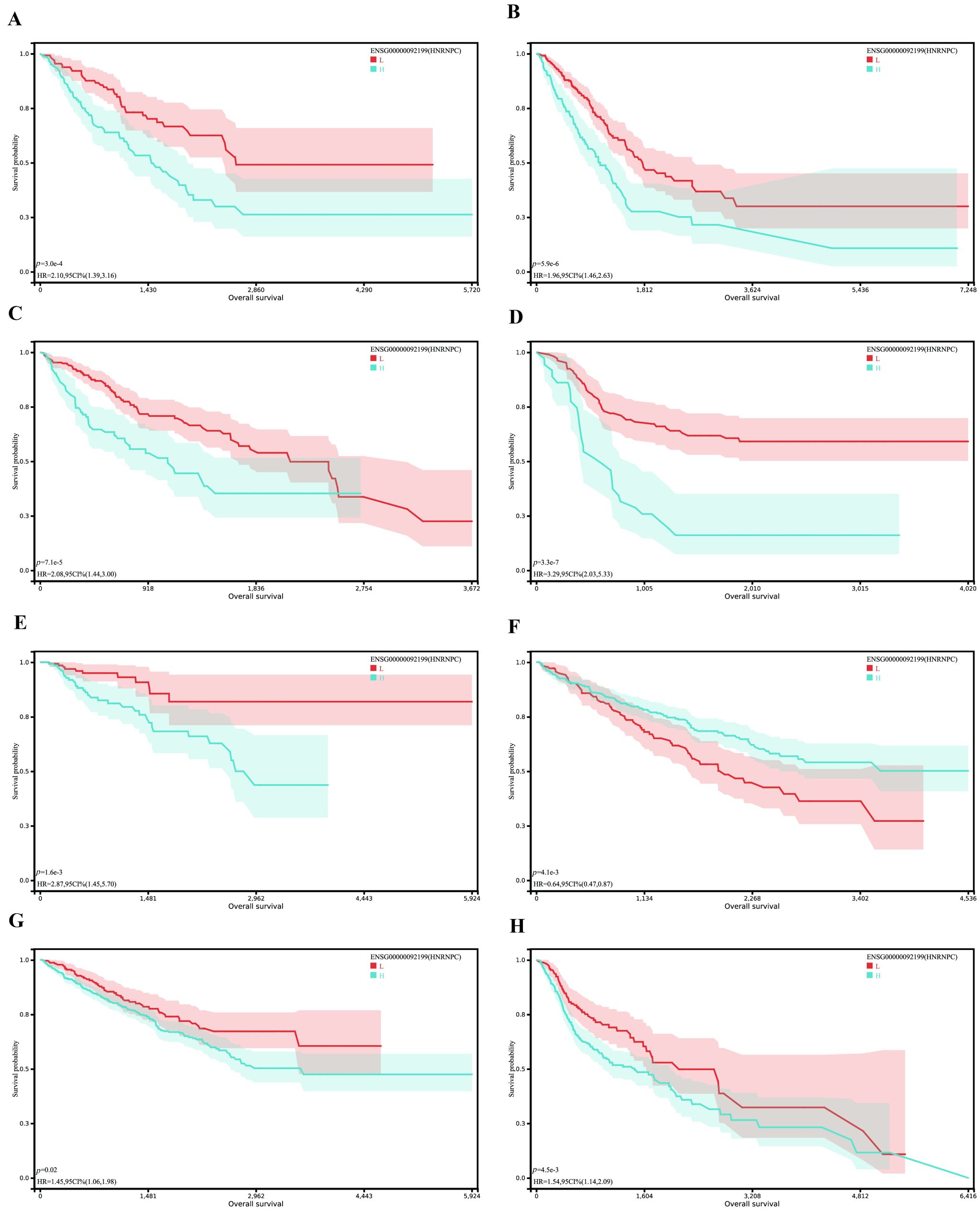 - HNRNPC has a close association with overall survival (OS) in various tumors. <bold>(A-H)</bold>: Kaplan-Meier (<bold>KM</bold>): survival analysis further confirmed the association between HNRNPC and OS in HNSC, KIPAN, KIRC, KIRP, LAML, SRAC, LUAD, and LIHC cancer types. (TIF)