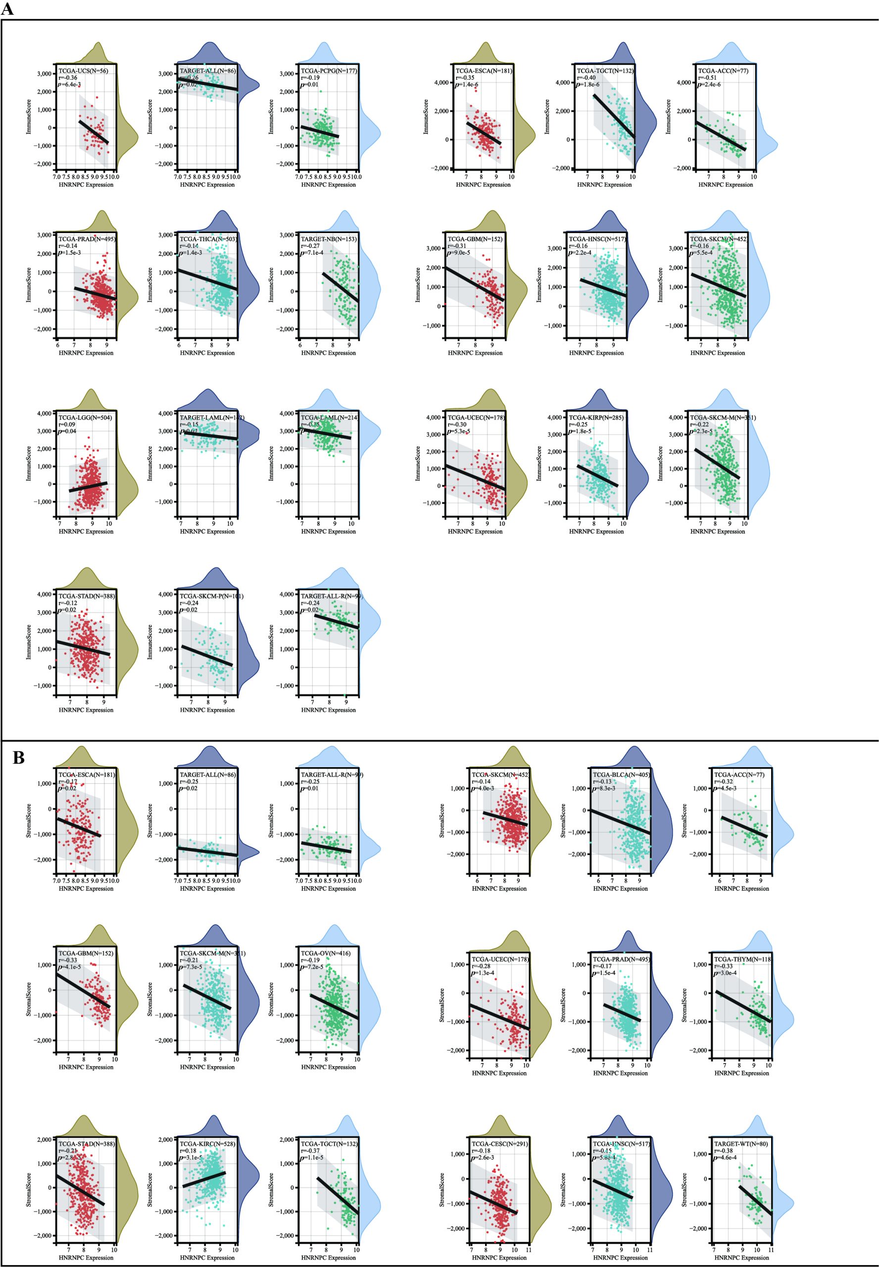 First, utilizing a standardized dataset (https://portal.gdc.cancer.gov/) encompassing various cancers, we examined the expression profiles of HNRNPC in conjunction with 150 reference genes related to immune pathway, including 18 chemokine receptors, 41 chemokines, 24 immunoinhibitors, 21 MHC-related genes, and 46 immunostimulators, utilizing the standardized dataset encompassing various cancers. Subsequently, we retrieved HNRNPC gene expression data along with 60 immune checkpoint markers, 18 chemokine receptors, 41 chemokines, and 21 MHC-related immune pathway markers from the comprehensive dataset [ref. 30]. We excluded samples with zero expression levels as well as all control samples from the analysis. Furthermore, each expression value underwent a log2(x + 0.001) conversion.