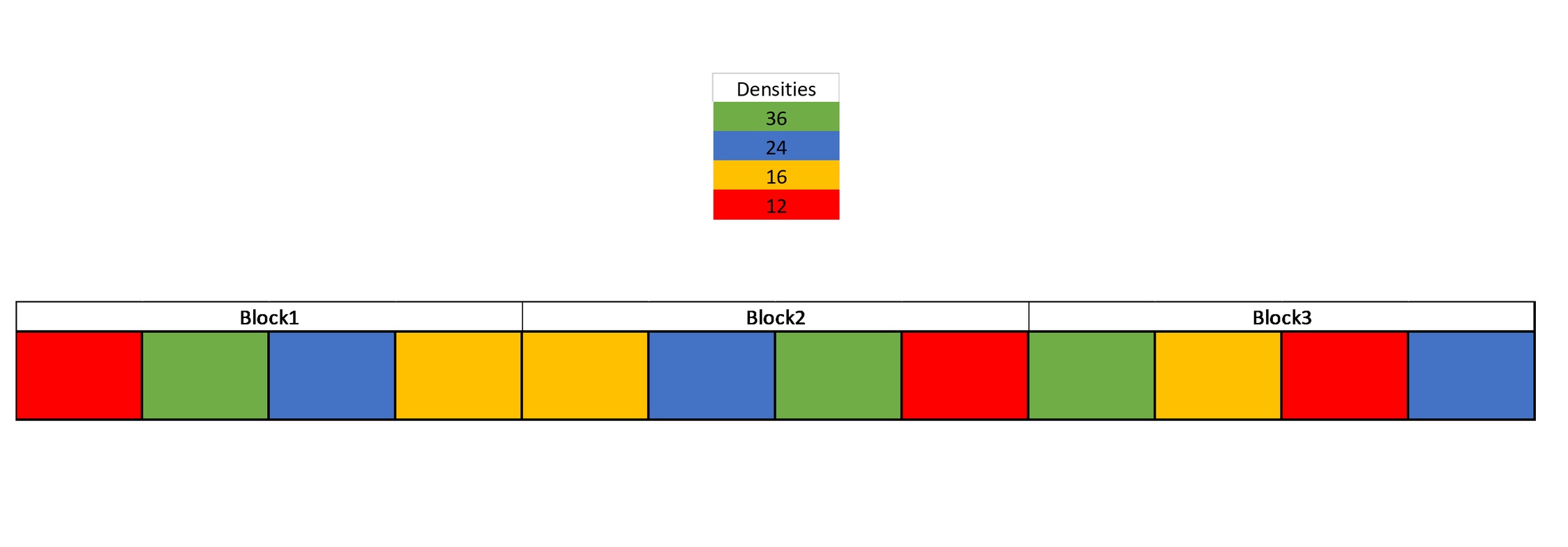 This trial compared four levels of DVP (1, 2, 3, and 4 weeks). The trial was a split-plot design with three replicates, each corresponding to a 2 × 2.5 m2 greenhouse table. The greenhouse tables were aligned one behind the other from the west to the east side of the greenhouse compartment, resulting in a continuous trial area of 15 m2. Each replicate consisted of four contiguous main plots, each containing 16 plants (four rows and four columns) of the same DVP in a PD of 17 plants m-2. The sub-plot factors in this trial were the two substrates used and the five harvest dates (0, 20, 35, 49, and 61 days after flower induction). Harvest date 0 days after flower induction refers to the end of the vegetative phase for all treatments. The substrate was introduced as an additional factor to consider the possible effects of the specific properties of the substrate in combination with the constant pot size and the concentration of the slow-release fertilizer for all tested DVPs. Therefore, peat and coco mixtures were selected, which are commonly used as substrate mixtures in the cannabis industry. At harvest dates 0 and 49 days after flower induction, a single plant per substrate-main plot combination was harvested. On the other three dates, two plants per substrate and main plot were harvested resulting in a total of eight plants per substrate and 16 plants per main plot. Treatment combinations were allocated to plants in each main plot according to a Graeco-Latin square design using harvest date as one factor with four levels (20, 35, 61, and 0/49 days after flower induction) and the combination of plant number and substrate as the second factor (Fig 2).