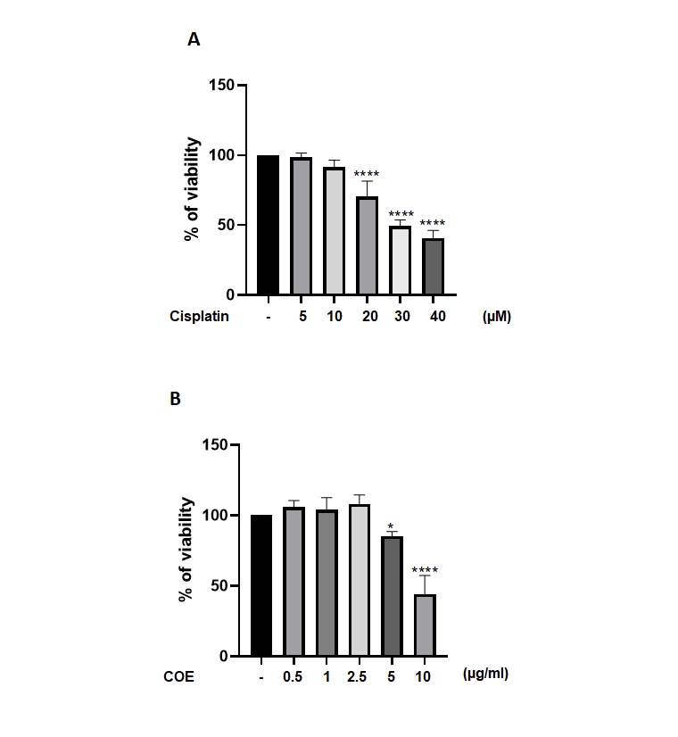 All in vivo experiments were performed on six to eight weeks old black male mice bred in the animal facility at the Lebanese American University. Mice were housed under optimum conditions of temperature (22 ± 2 ◦C) and humidity (50 ± 5%) with an alternating cycle (12h) of light and dark. Animals were supplied with standard laboratory chow diet and water. All experimental protocols were approved by the Lebanese American University Animal Care and Use Committee (ACUC). Mice were divided into six Groups, each group containing 5 mice where mice were injected for three days before sacrifice. For cisplatin treatment, mice were injected with a single dose of cisplatin (20mg/kg, i.p.), while control animals were injected with a comparable volume of PBS 1X. To test the effect of COE, different doses of COE (2.5, 5 and 20 mg/kg, i.p.) dissolved in in a mixture of Ethanol: Tween80: PBS (1:1:18) were administered for three consecutive days before cisplatin treatment. Animals were euthanized 72 h after cisplatin treatment to collect blood samples.