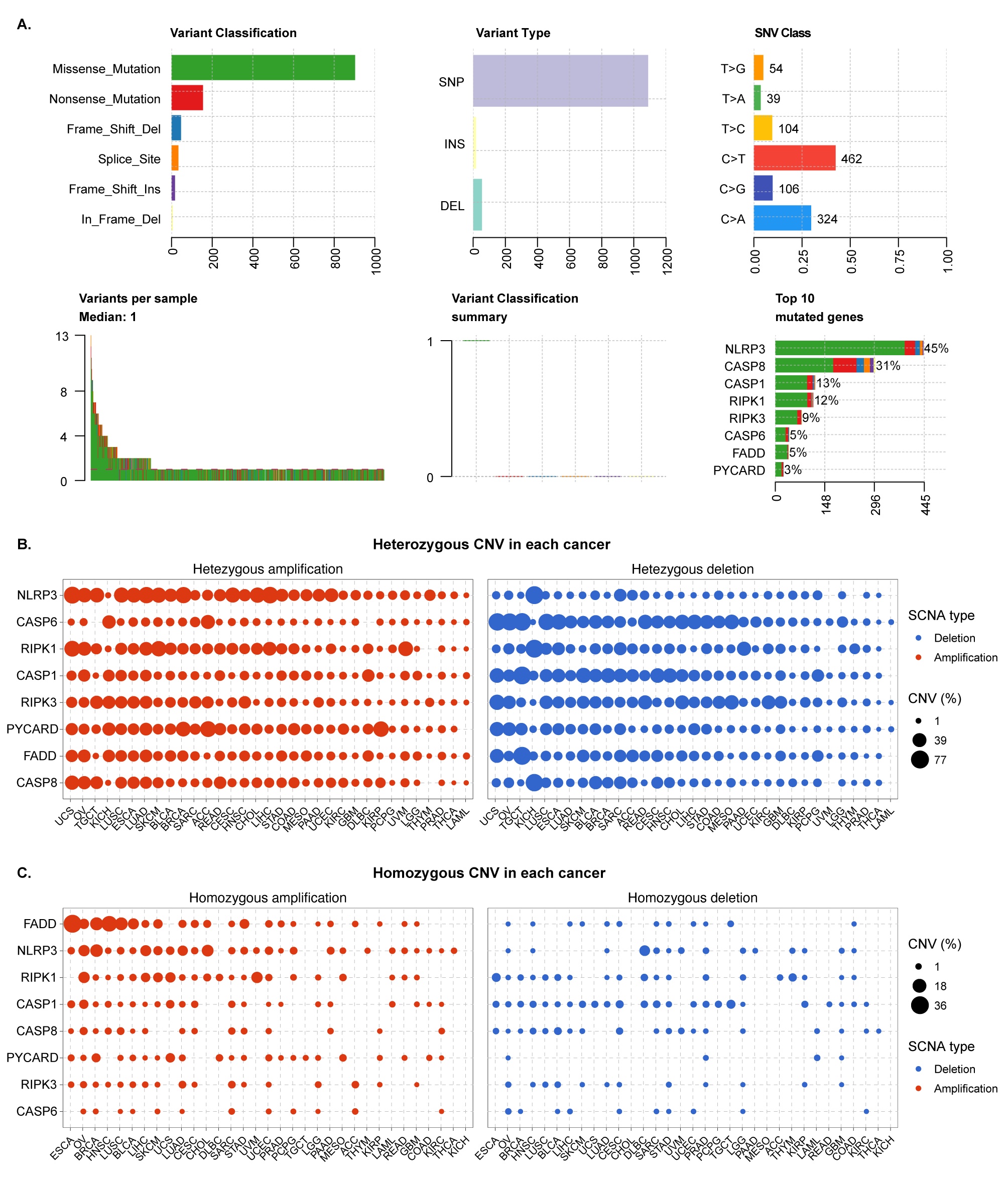 In this study, we scrutinized the genetic, epigenetic, and transcriptional profiles of eight core PANoptosome component genes across 33 different cancers. A pronounced divergence was noted in the molecular characteristics of PANoptosome component genes between tumors and normal tissues. Certain PANoptosome genes exhibited a heightened SNV frequency and showed significant correlations with CNV and methylation. Furthermore, these genetic mutations and epigenetic modifications had a discernible impact on the expression of PANoptosome genes. This underscores the pivotal role of genetic alterations in driving cancer progression. Consequently, these findings not only lay the groundwork for an in-depth exploration of PANoptosome-related mechanisms but also enhance our comprehension of the intricacies associated with the participation of PANoptosome in tumorigenesis and development.