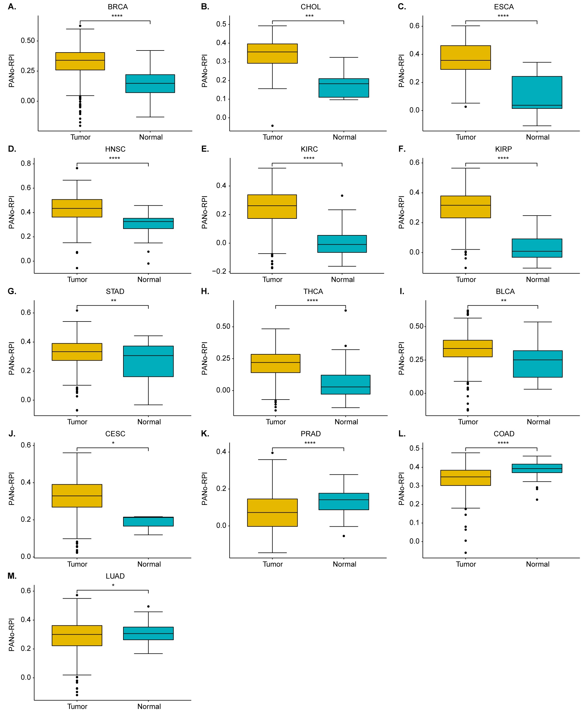 To further explore the potential clinical relevance of PANoptosis from an overall perspective, we performed a single-sample gene set enrichment analysis (ssGSEA) to develop the computational model PANo-RPI for the assessment of the PANoptosome assembly potential based on the expression of eight core PANoptosome component genes, including RIPK1, RIPK3, NLRP3, CASP1, CASP6, CASP8, FADD, and PYCARD. All cancers showed a wide range of PANo-RPIs, and all had some individuals with high PANo-RPIs (Fig. 3A). By comparing the levels of PANo-RPI, significant heterogeneity was found across 33 cancers. Specifically, The PANo-RPI was distinctly high in MESO, LAML, DLBC, HNSC, and THYM, whereas it was demonstrably low in PCPG and KICH (Fig. 3A). Additionally, we found that the PANo-RPI of tumors was higher than normal tissues in BRCA, CHOL, ESCA, HNSC, KIRC, KIRP, STAD, THCA, BLCA, and CESC (Fig. S3A–J) but lower in PRAD, COAD, and LUAD (Fig. S3K–M). Furthermore, we compared the PANo-RPI levels between cancerous and adjacent non-cancerous specimens. The comparison showed that PANo-RPI levels were increased in BRCA, CHOL, ESCA, HNSC, KIRC, KIRP, STAD, and THCA (Fig. 3B–I) but decreased in PRAD (Fig. 3J). These findings suggest that the PANoptosome or PANoptosis has distinct relationships with different cancers during tumorigenesis and progression.