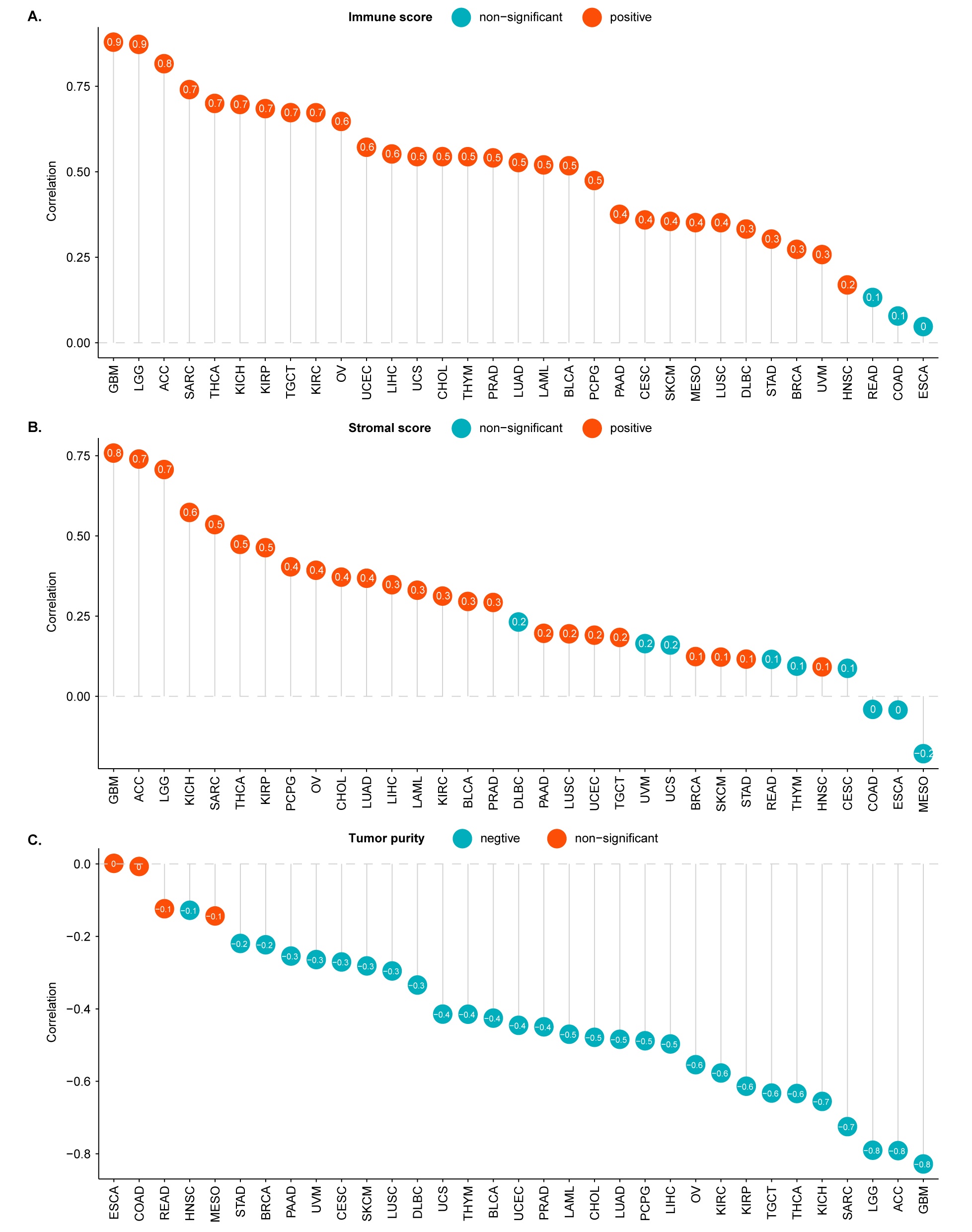 - K Yoshihara, M Shahmoradgoli, E Martinez, R Vegesna, H Kim, W Torres-Garcia, V Trevino, H Shen, PW Laird, DA Levine, SL Carter, G Getz, K Stemke-Hale, GB Mills, RG Verhaak. Inferring tumour purity and stromal and immune cell admixture from expression data. Nat Commun, 2013. [PubMed]