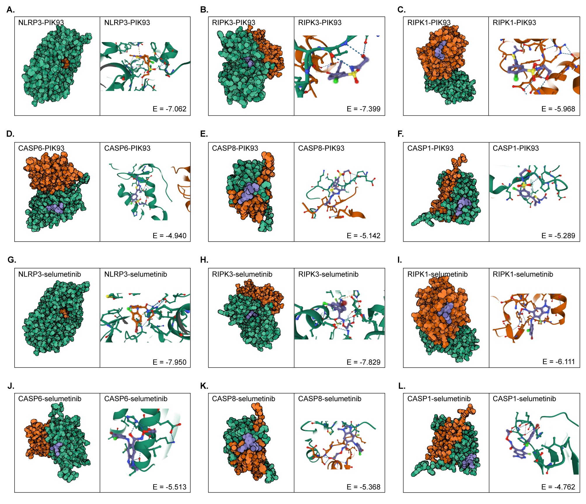 Strategies that can activate PANoptosome assembly and induce tumor cell apoptosis warrant further in-depth exploration. In this study, we focused on mining small-molecule drugs that may directly target the PANoptosome. We analyzed the correlation between the mRNA expression of each PANoptosome gene and the half-maximal inhibitory concentration (IC50) of each small-molecule compound in two drug-related databases (GDCS and CTRP). Figure 8A, B summarize the correlation between gene expression and sensitivity to GDSC and CTRP drugs (top 30) in pan-cancer analysis. These results showed that the IC50 values of most of the top 30 drugs were significantly negatively correlated with the expression of RIPK3, CASP8, NLRP3, PYCARD, and CASP1, which implied that these small-molecule drugs might be potential activators of the PANoptosome. Notably, four small-molecule drugs, PIK-93, SNX-2112, AZD7762, and selumetinib, showed a significant correlation with the PANoptosome components in both the GDSC and CTRP databases (Fig. 8A, B). Among these, SNX-2112 and AZD7762 induce apoptosis in several tumor cells (Landau et al. ref. 2012; Cheng et al. ref. 2021; Ozgiray et al. ref. 2022). To further evaluate the binding affinities of PIK-93, SNX-2112, AZD7762, and selumetinib for each PANoptosome component, molecular docking analysis was performed. The binding poses of the four candidate drugs and their corresponding interactions with protein residues of NLRP3, RIPK3, RIPK1, CASP6, CASP8, and CASP1, as well as the corresponding binding energy for each interaction, were obtained using Autodock Vina v.1.2.2 (Figs. 9, S8 and Table S8). We found that each candidate primarily bonded to these protein residues via hydrogen bonds and electrostatic interactions. In addition, the majority of these binding energies were less than − 5 kcal/mol, indicating stable binding between the four small-molecule drugs and the PANoptosome components. Among these, SNX-2112 and AZD7762 showed significantly stable binding with NLRP3 (Fig. 9A and G) and RIPK3 (Fig. 9B and H), with corresponding binding energies of less than − 8 kcal/mol. These findings provide insights into the mechanism of PANoptosome activation and its value in clinical applications.